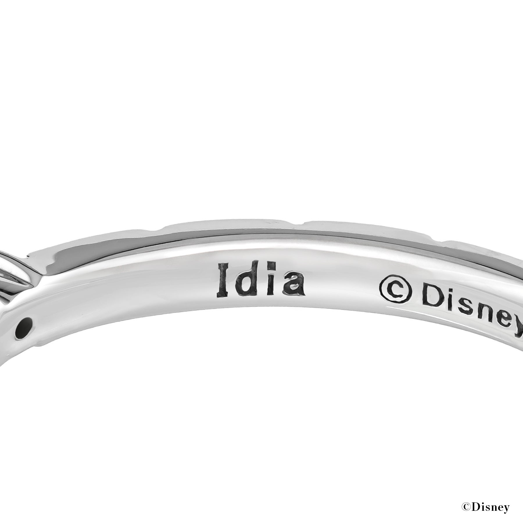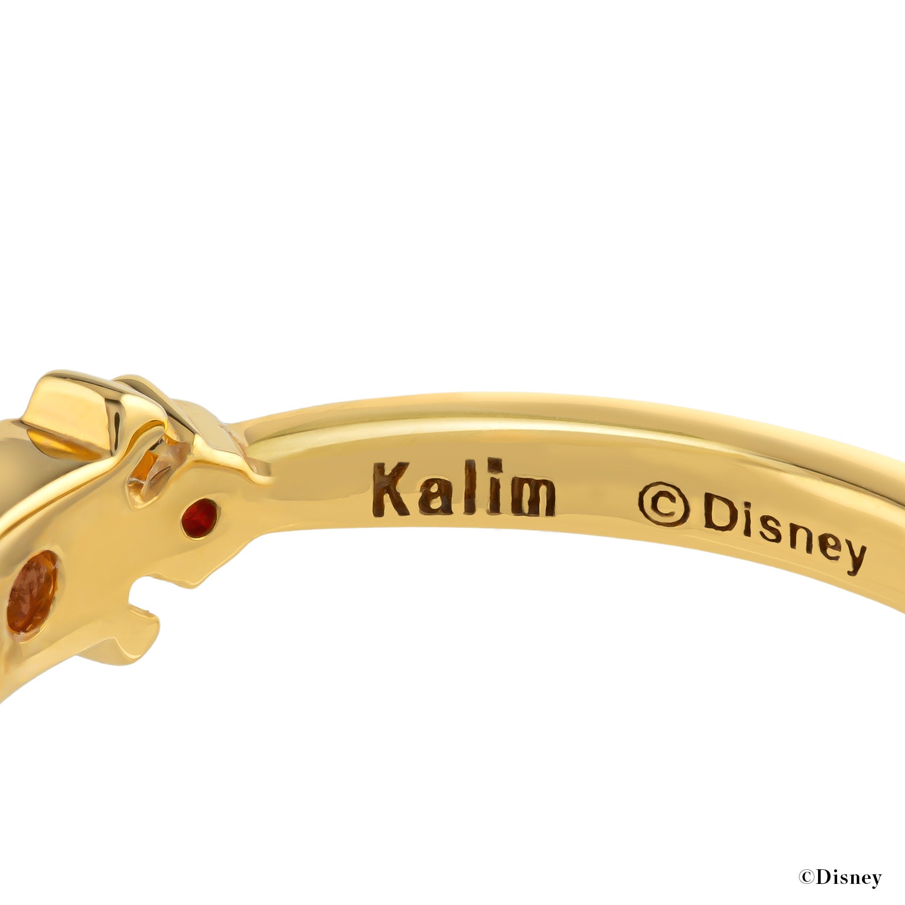 メインストーンにはホワイトトパーズを使い「カリム・アルアジーム」の髪色を表現し、魔法の絨毯をイメージした石枠にしています。脇石には瞳や衣装のカラーをイメージしたレッドカラーのキュービックジルコニアを留め、カリムらしい色合いに仕上げました。アームはターバンの煌びやかな装飾や模様をデザインしています。裏面にキャラクター名を刻印し、しっかりとカリムの雰囲気が感じられつつ、さりげないデザインでデイリー使いしやすいリングになっています。