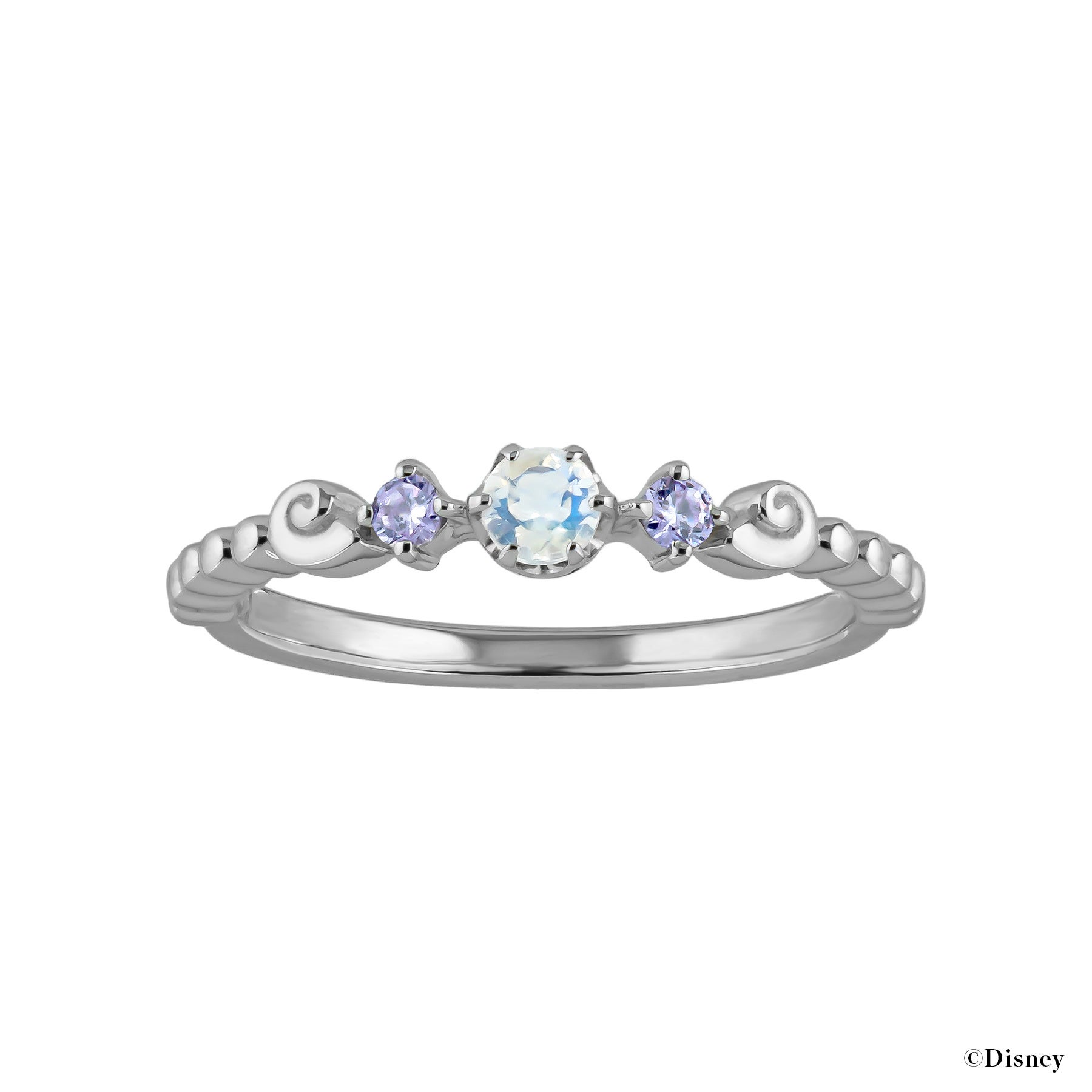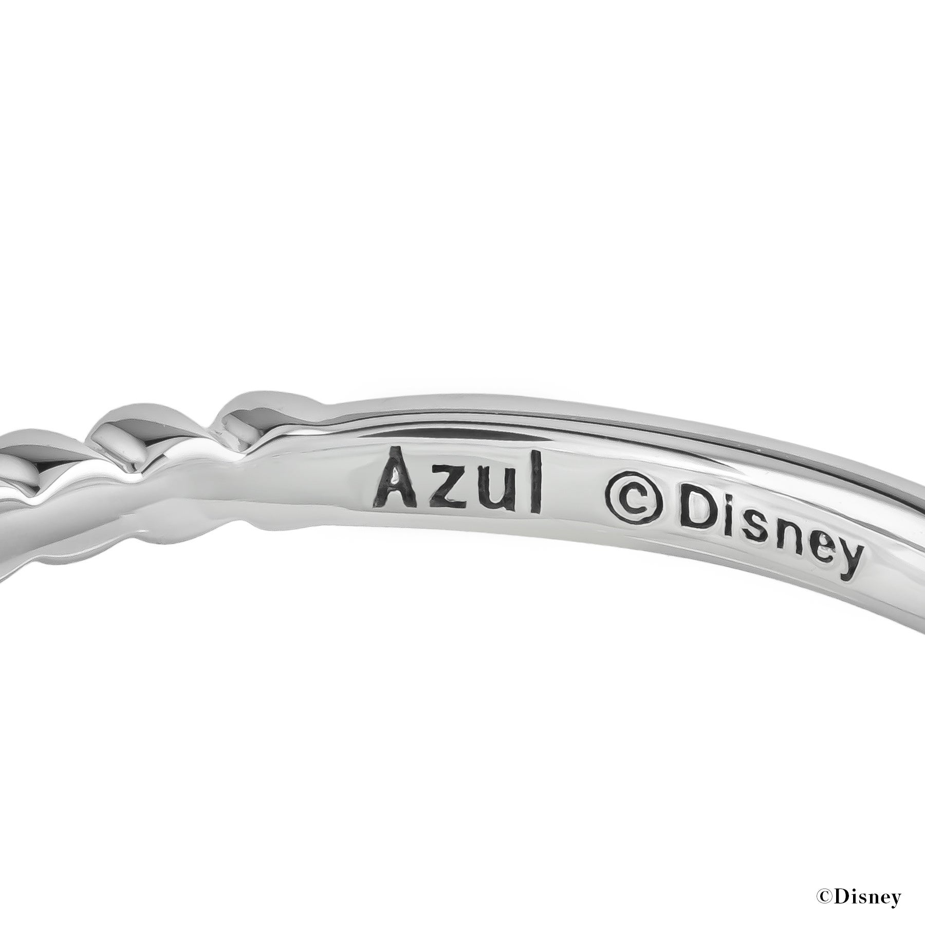 メインストーンにはブルームーンストーンを使い「アズール・アーシェングロット」の髪色を表現。脇石には瞳や衣装のカラーをイメージしたラベンダーカラーのキュービックジルコニアを留め、アズールらしい色合いに仕上げました。アームにはアースラの貝殻や、たこ足の吸盤、海の泡モチーフをデザインしています。裏面にキャラクター名を刻印し、しっかりとアズールの雰囲気が感じられつつ、さりげないデザインでデイリー使いしやすいリングになっています。