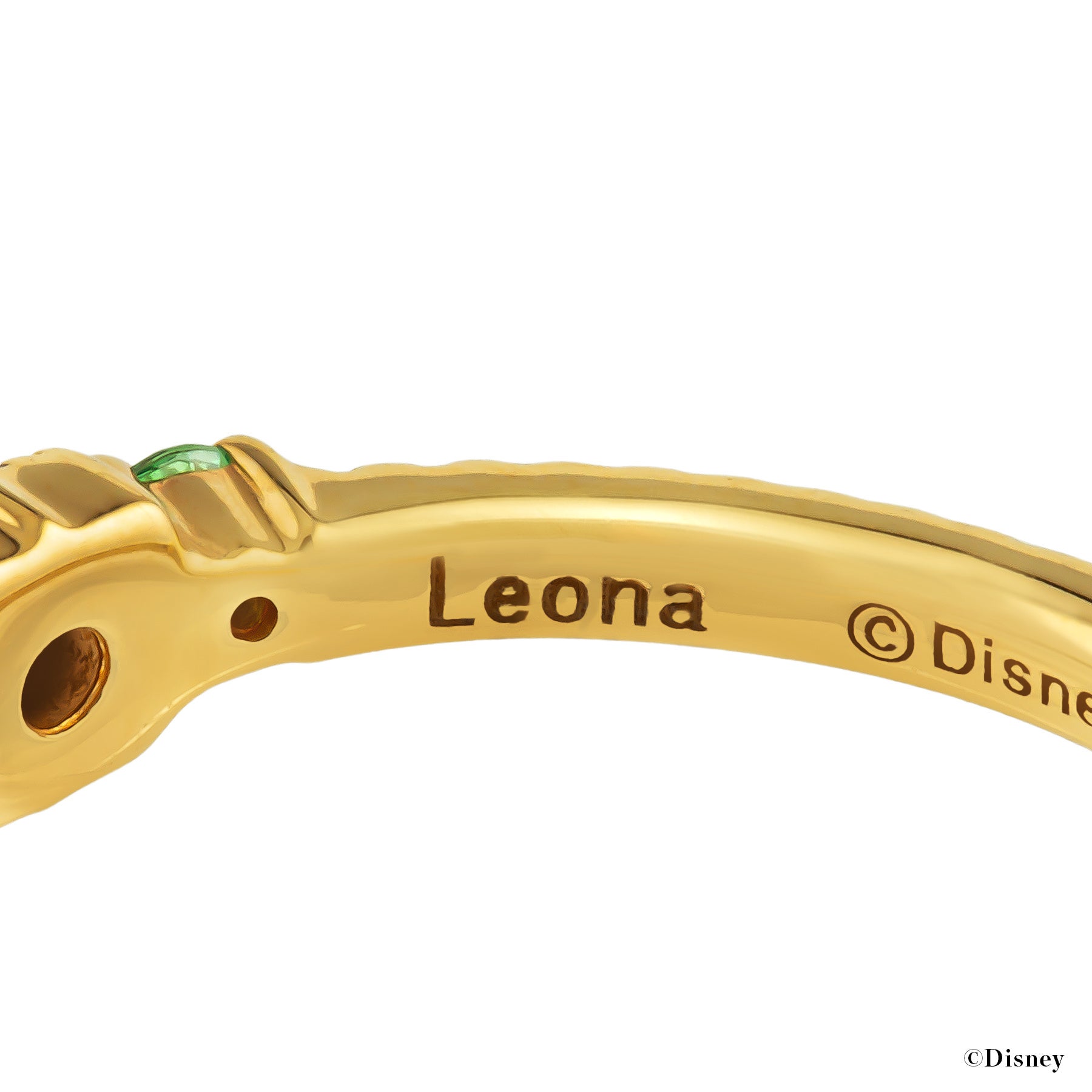 メインストーンにはスモーキークォーツを使い「レオナ・キングスカラー」の髪色を表現し、ライオンのたてがみをイメージした石枠にしています。脇石には瞳のカラーをイメージしたグリーンカラーのキュービックジルコニアを留め、レオナらしい色合いに仕上げ、アームは瞳の傷とサバンナの植物モチーフでアシンメトリーなデザインにしました。裏面にキャラクター名を刻印し、しっかりとレオナの雰囲気が感じられつつ、さりげないデザインでデイリー使いしやすいリングになっています。