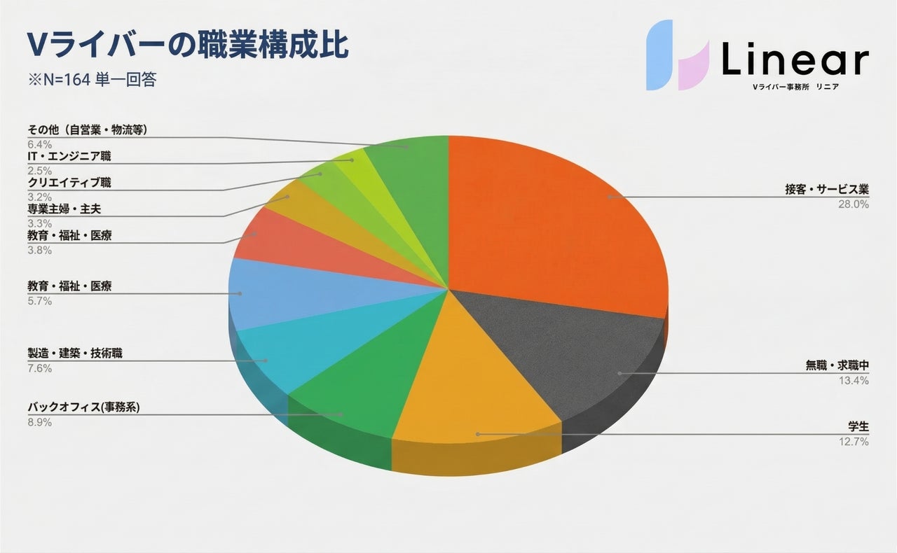 Vライバー事務所「Linear(リニア)」(本社:東京都渋谷区、代表:石井翔)は、所属するVライバーを対象に「活動実態に関するアンケート調査」を実施いたしました。その結果、Vライバーの約4割が現役の会社員であり、本業と両立しながら「アバターを通じた副業・自己実現」を行っている実態が明らかになりました。また、職種別では「接客・サービス業」が最多となり、対人スキルをデジタル空間へ転用する新しい働き方の潮流も見えてきました。