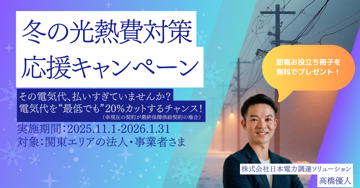法人向けに電力契約・再エネ調達の支援を行う株式会社日本電力調達ソリューション(本社:東京都港区、代表取締役社長:高橋優人、以下「当社」)は、関東圏を中心とする中小企業・事業所を対象に、「冬の光熱費対策応援キャンペーン」を11月1日より開始いたします。