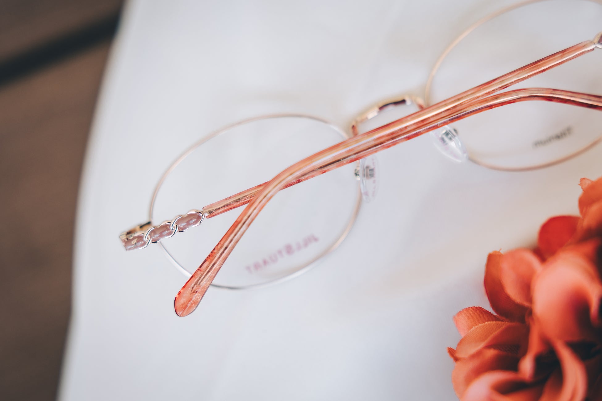 透け感のあるアセテートが軽やかに輝き、メタルパーツの上品さと相まって視線を惹きつけるアイウェア。日常にそっと華やぎを添え、女性らしい柔らかさと上品さを際立たせます。