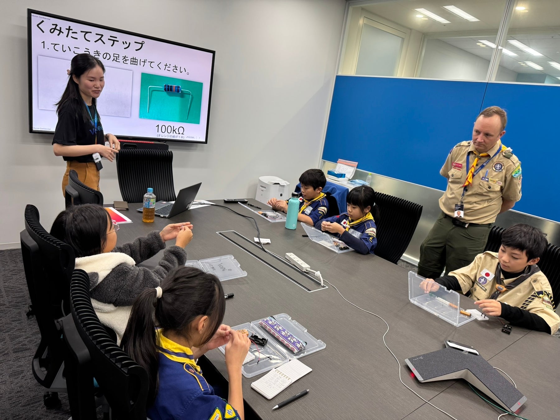 はじめに、さまざまなバックグラウンドを持つ社員が、それぞれの言語で、各国の文化や料理を紹介。その後、スカウトは、半導体を使ってLEDライトを光らせる回路づくりのワークショップに参加しました。多国籍の社員ボランティアと交流しながら、半導体の世界を知り、ものづくりの面白さを体験しました。アメリカで現役ボーイスカウトとして活動している社員とは、スカウト活動についての話も盛り上がりました。