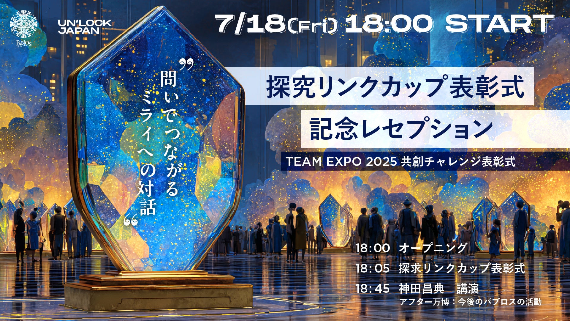パブロス株式会社(本社:東京都港区、代表取締役 神田昌典、以降パブロス)は、2025年日本国際博覧会(以降、「大阪・関西万博」)の「TEAM EXPOパビリオン」にて2025年7月18日に「共創チャレンジ」の取り組みを発表する6校を表彰する「探究リンクカップ表彰式~問いでつながる未来への対話」の記念レセプションを、同日18時よりYouTubeで生配信(https://www.youtube.com/live/C49g7pBnz4k)することをお知らせいたします。
