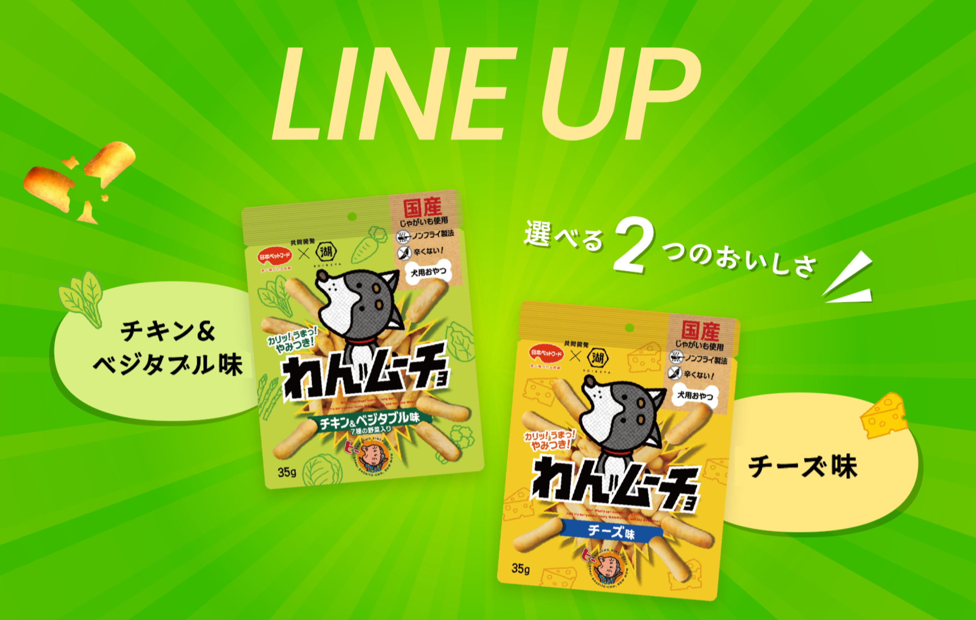 ラインアップは「チキン&ベジタブル味」、「チーズ味」の2種展開!