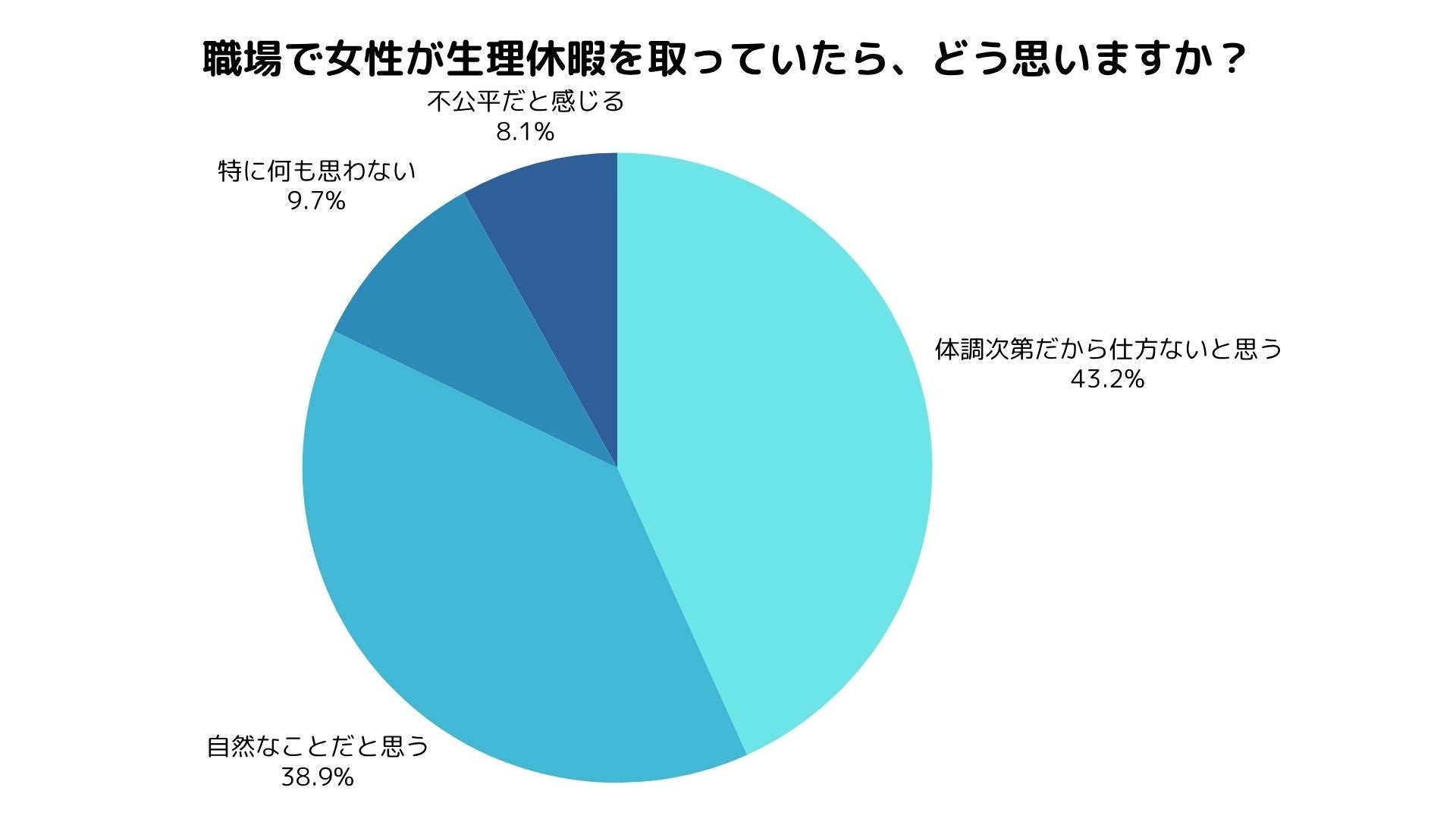 職場で女性が生理休暇を取っていたらどう思うかという質問に対し、「体調次第だから仕方ないと思う」43.2%、「自然なことだと思う」38.9%と、約8割の男性が肯定的な意見を示しました。