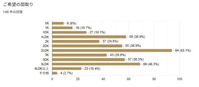 次に希望される間取については2LDKが最も高く全体の63.1%で次いで3LDKが46.3%という回答を得ている(図9参照)。