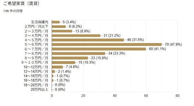賃貸の場合、5~6万円の回答が47.9%と最も高く、ついで6~7万円が41.1%となっている(図8参照)。
