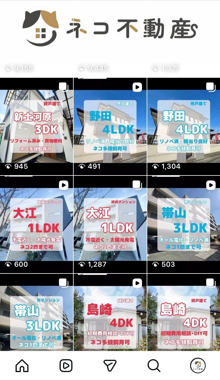 ネコ不動産の主な集客はSNS(インスタ、TikTok)であるが、賃貸物件(赤色)と売買物件(青色)を交互に掲載しており、紹介頻度は等しくなっている(図3・図4参照)。