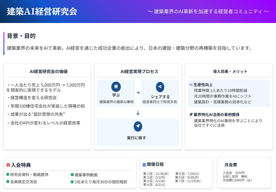 建築AI経営研究会にご参加を希望される方は下記フォームよりお申込み頂けます。