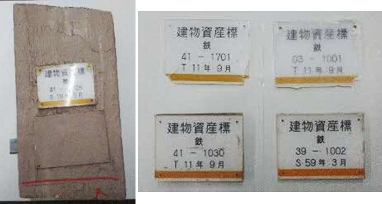 半田駅高架化工事に伴い、2021年に旧駅舎の柱から取り外された建物資産標。構造物と一体となったもの(1個)、プレートだけ取り外したもの(4枚)のセット。建物の種類や竣工年月日を記録した標識であり、建物の情報を明確化するために設置されます。
