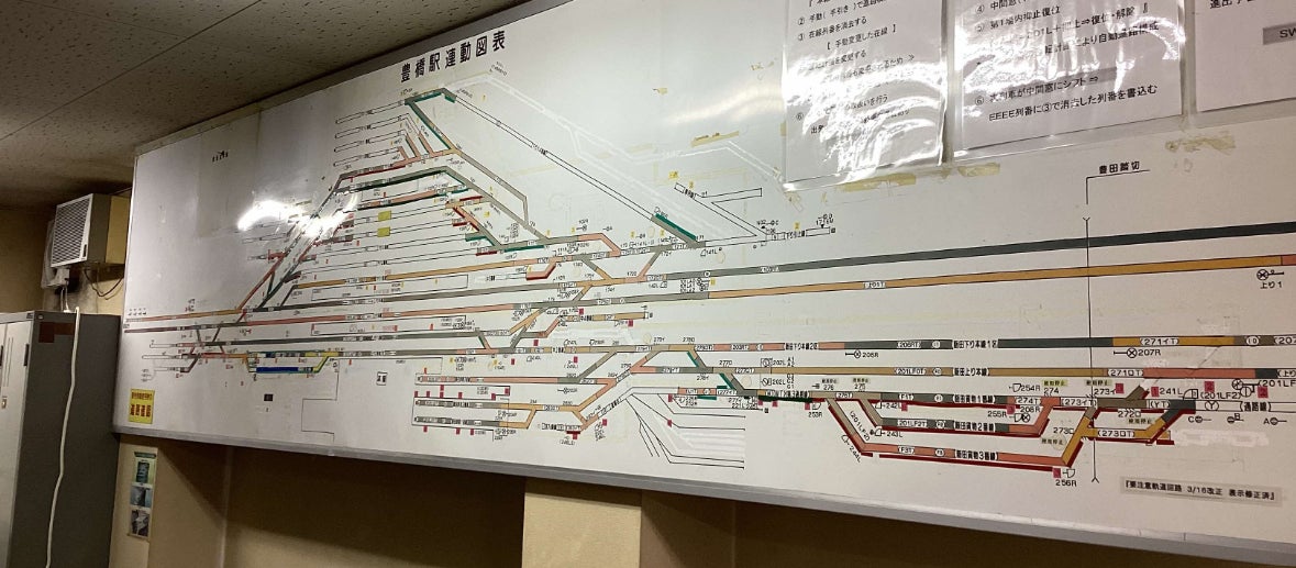 豊橋駅の信号扱所に設置されていた連動図表。2025年1月の連動取替工事で取外して保管されていたもの。駅構内に列車を安全、かつ効率的に進出入させるために作成するもので、駅構内の信号機と転轍機(ポイント)の制御条件をまとめた図と表で構成されます。