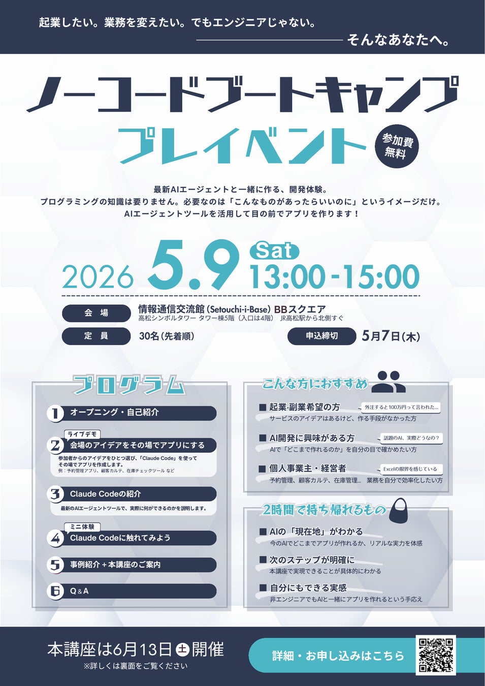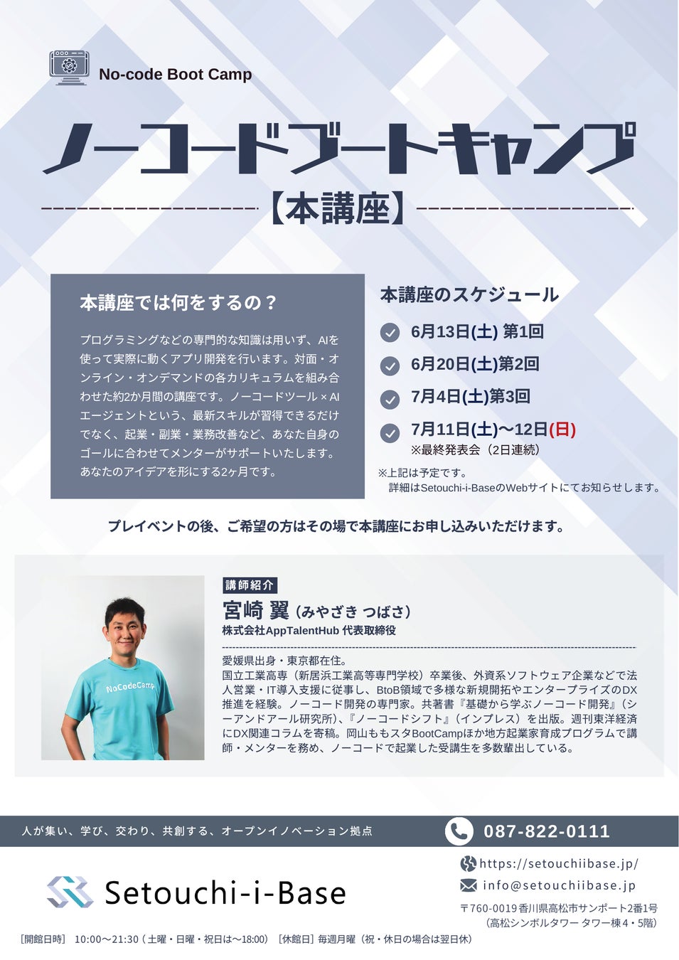 香川県においても、起業・副業を目指す方、個人事業主、経営者から、AIとノーコードを活用した事業創出への関心が高まっています。こうした地域ニーズを受け、情報通信交流館(Setouchi-i-Base)主催のもと、2026年6月より全5日間の「ノーコードブートキャンプ」を開講いたします。本講座に先立ち、最新AIエージェントツールの可能性を体感いただくプレイベントを開催し、ATH代表取締役の宮崎翼が講師として登壇します。