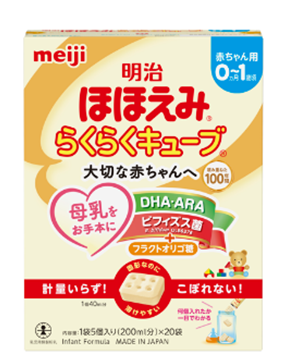「明治ほほえみ らくらくキューブ」は、「明治ほほえみ」に添加物を一切加えることなく固めた、業界初のキューブタイプの粉ミルク(※1)です。