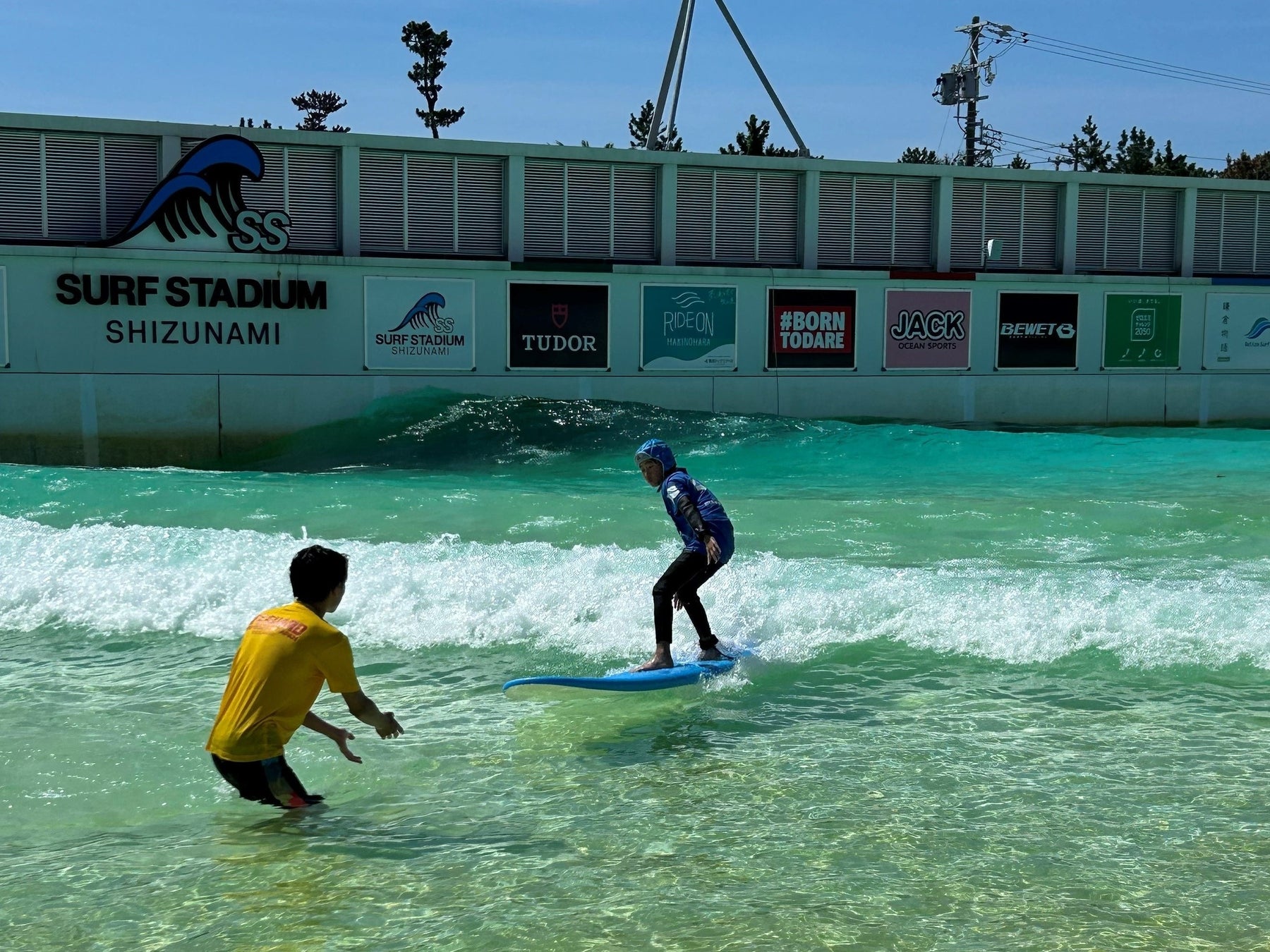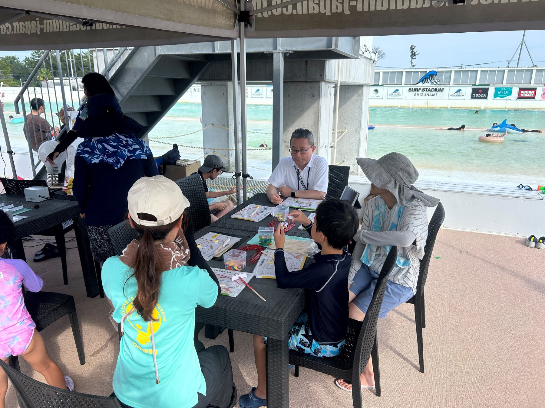 当日はインストラクターの丁寧な指導のもと、安心して初めての波乗りに挑戦していただけます。同伴のご家族も楽しんでいただけるよう、発電体験ブースや工作教室のほか、浅瀬プールも開放予定です。