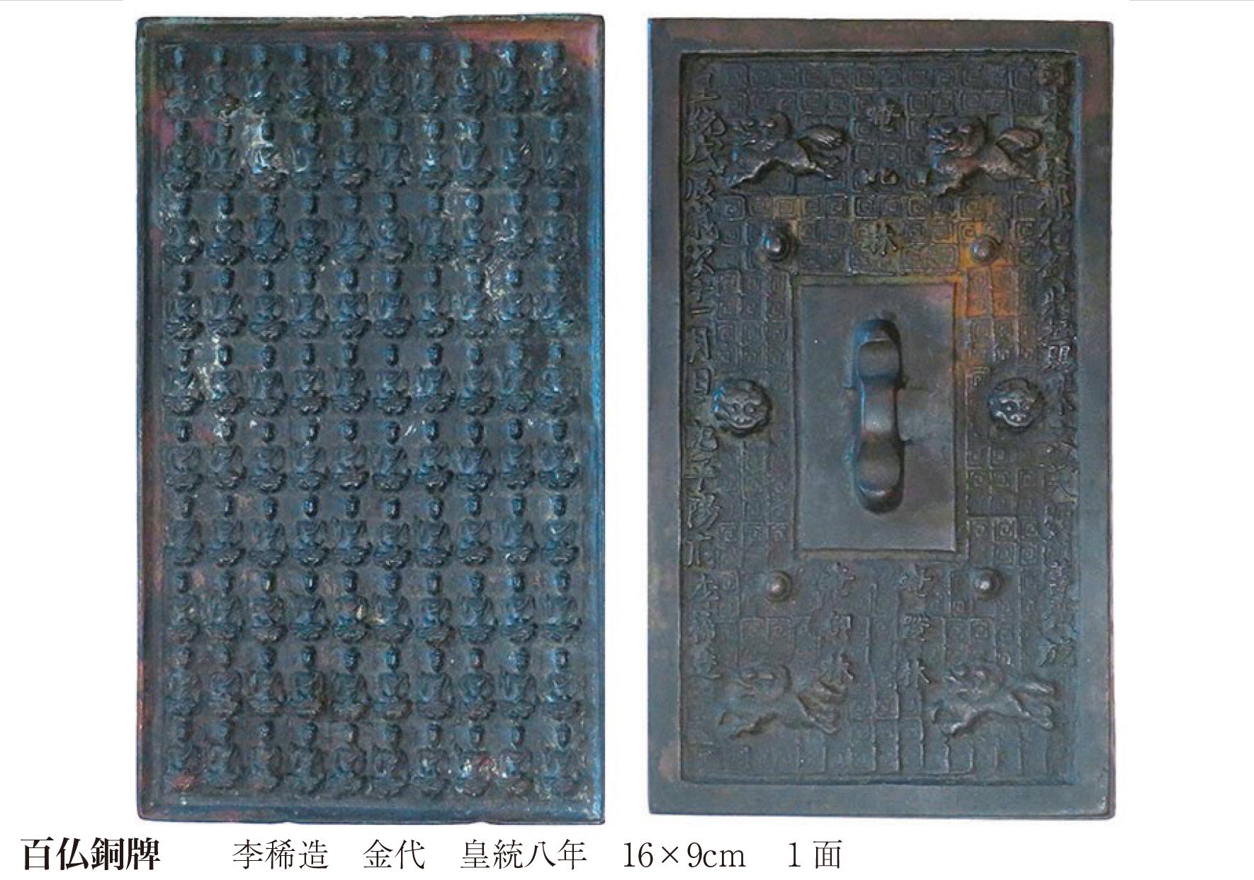 中国、金の時代に作られた100体の仏像が象られた銅版。表面には縦10体×横10体の仏像が並び、裏面には由来を示す銘文が鋳造されています。銘文からはこの作品が西暦1148年に現在の山西省南部にあった平陽府で李稀(りき)という人物によって作成された事がわかります。金代では、二代皇帝太宗・呉乞買(うきまい)が仏教に帰依した事で仏教文化が盛んになりました。この作品は往時の仏教文化を今に伝える貴重な文物で、同じ物が北京の故宮博物館に収蔵されています。
