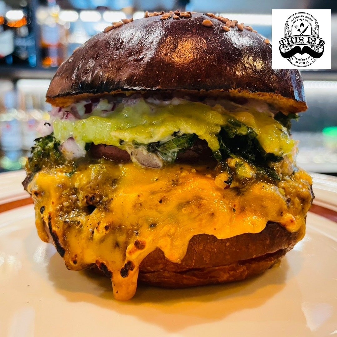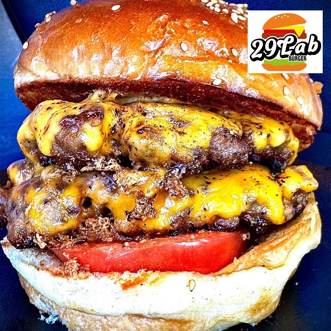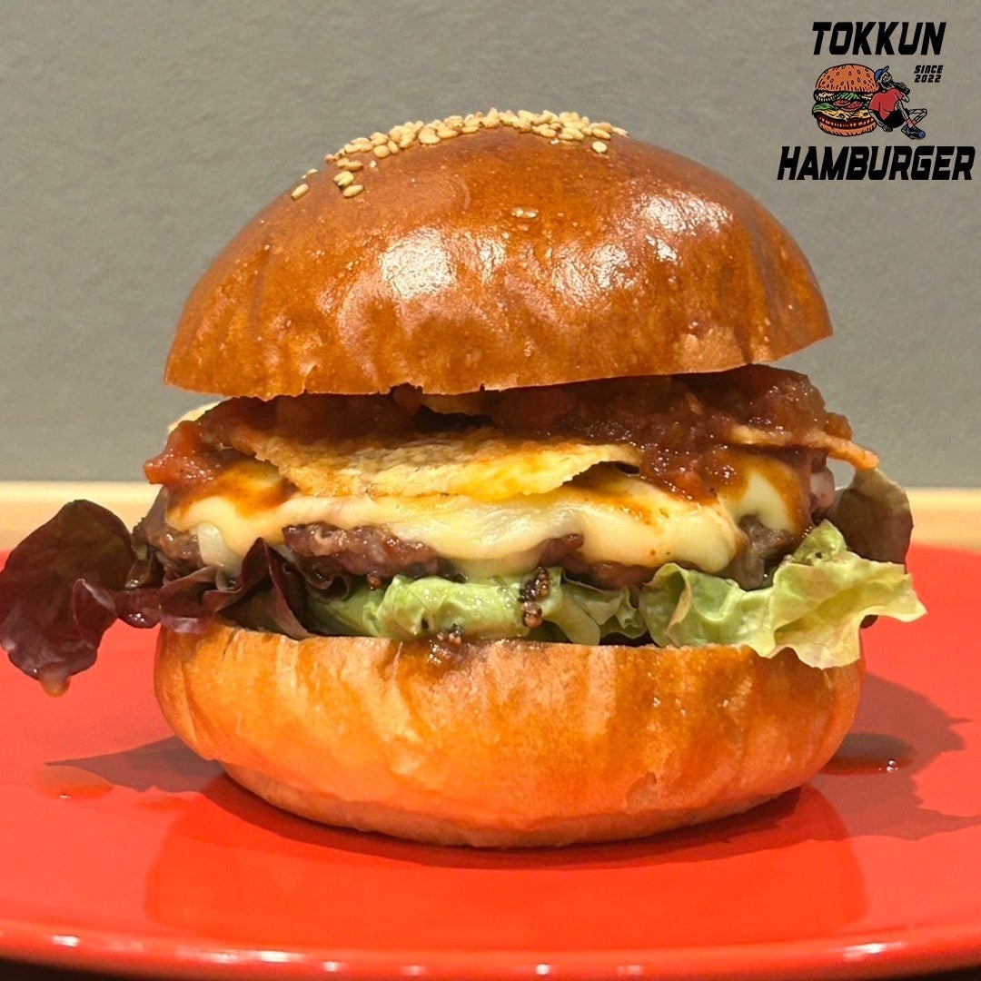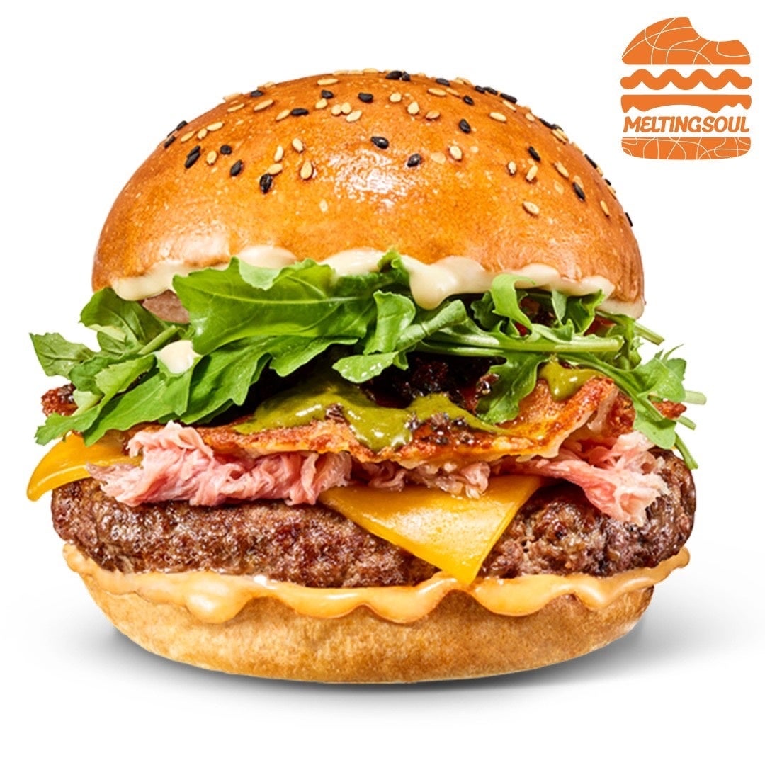 メルティングソウルの人気商品!U.Sビーフのスマッシュパティにチェダーとモッツァレラのダブルチーズ、幾重にも重なったハムの食感に、黒トリュフ、えごまとフィッシュソースのチミチュリとガーリックマヨが見事にマッチ!酸味、甘み、辛味が一体となった