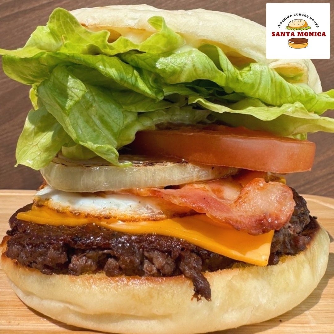 長崎県佐世保市由来の製法によるベーコンに、エッグ・チーズ・レタス・トマト・オニオンを加えたスペシャルバーガー!