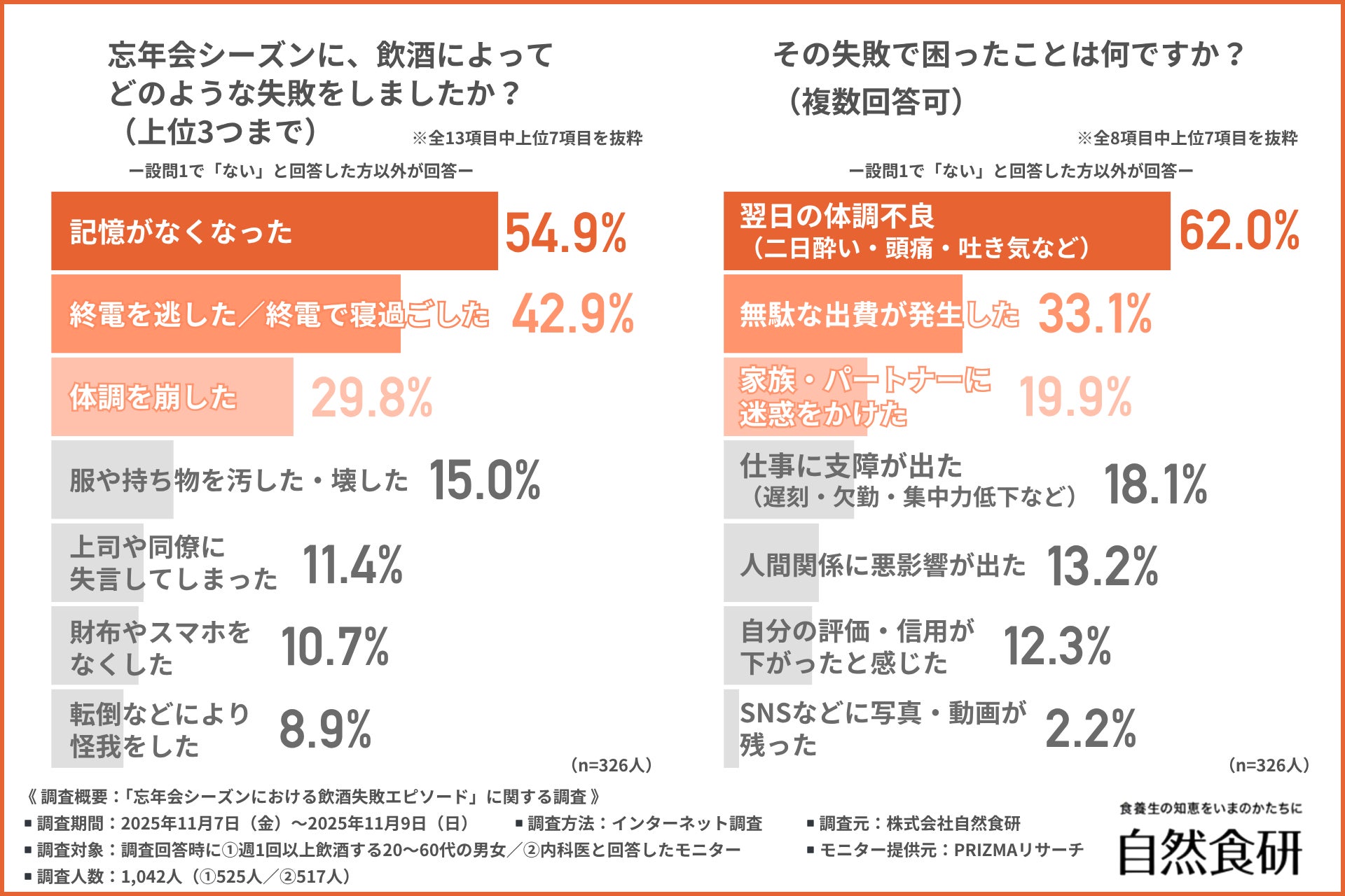 そこで今回、株式会社自然食研(https://www.sizenshokken.co.jp/)は、①週1回以上飲酒する20〜60代の男女/②内科医を対象に、「忘年会シーズンにおける飲酒失敗エピソード」に関する調査を行いました。