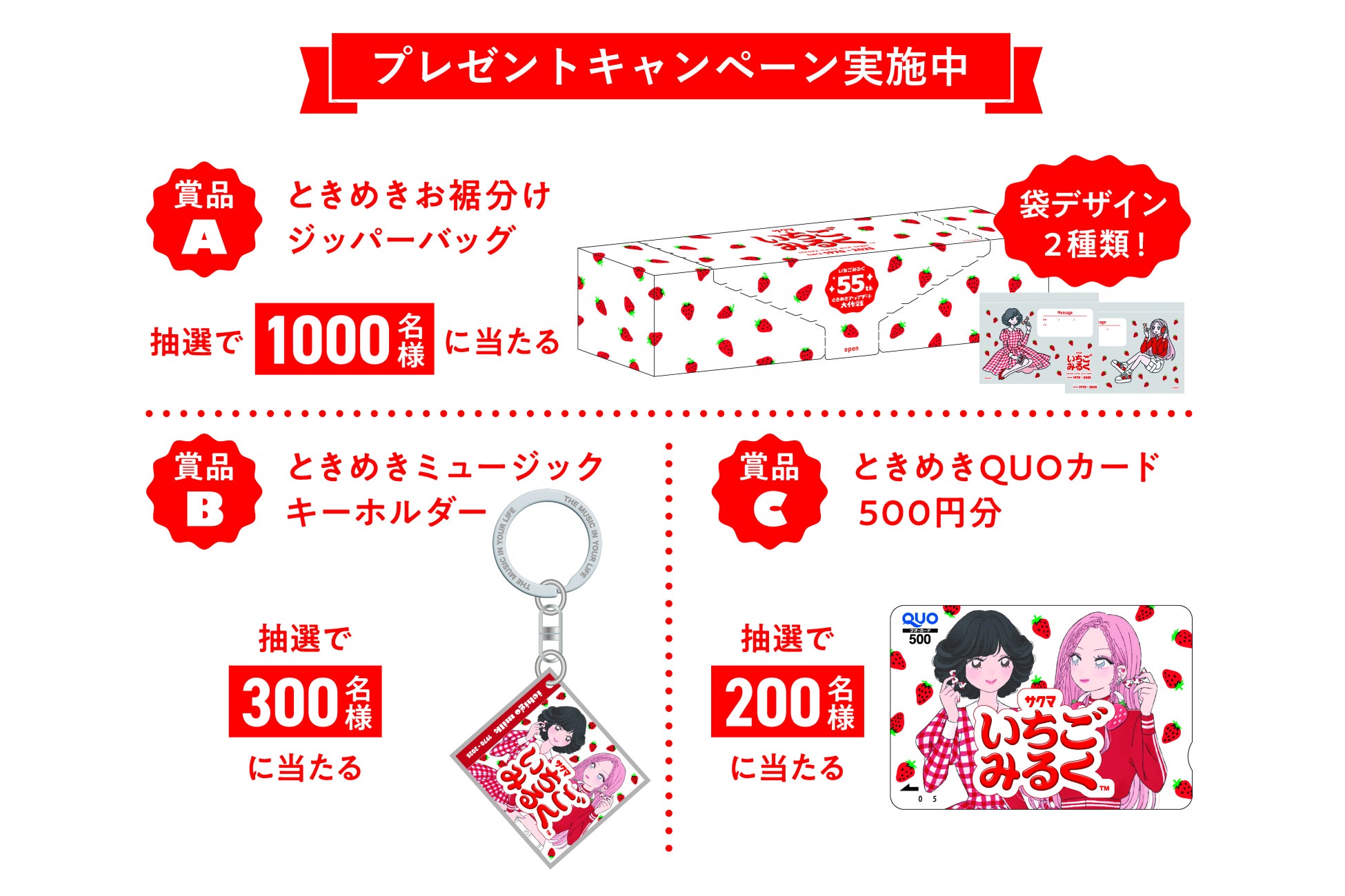 現在発売中の、イラストレーター・たなかさんのイラストが施された55周年記念パッケージ商品をご購入いただいた方の中から抽選で、特別なアイテムが当たるプレゼント企画を実施しております。アイテムの1つ「ときめきミュージックキーホルダー」は、スマートフォンにかざすと、ずまさんと鬼頭さんのコラボ楽曲が収録されている他、鬼頭さん単独バージョンの楽曲、お二人の対談音声もお聴きいただけますので、ふるってご応募ください。応募方法の詳細はキャンペーンサイトからご確認ください。