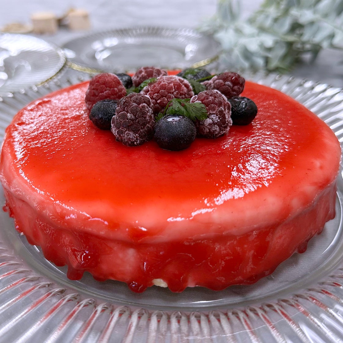 フランボワーズピューレを贅沢にまとわせた、モリナポオリジナルのチーズケーキです。まったりとした濃厚チーズと、フランボワーズの爽やかな酸味が絶妙のバランス!中央にフランボワーズとブルーベリーの果実を飾り、仕上げにチャービルを添えました。