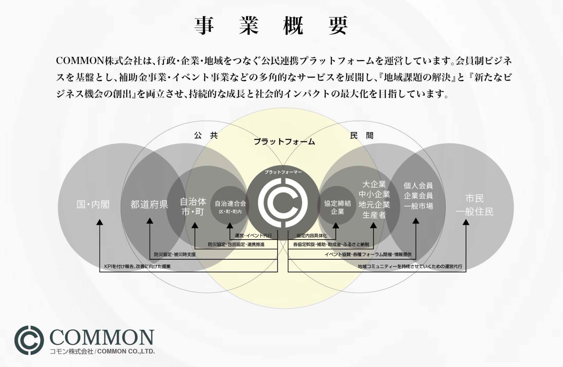• 団体紹介:COMMON株式会社は、「共創による地域と企業の持続的な価値づくり」をミッションに、全国の自治体・企業・市民団体と連携した公民共創型のまちづくりや防災・観光・教育分野のプロジェクトを企画・運営するソーシャルビジネス企業です。公民連携の会員制プラットフォーム事業や企業版ふるさと納税を活用した地域活性化や、移動型アンテナショップ「コモンズマルシェ」など、民間のノウハウを活かした地域課題の解決に取り組んでいます。各地の自治体との災害時連携協定や、防災イベント・フォーラムの企画を通じて、企業間連携による災害対応ネットワークづくりも推進。地域・企業・個人が“つながり合う”仕組みを構築し、未来志向の共創社会を目指しています。
