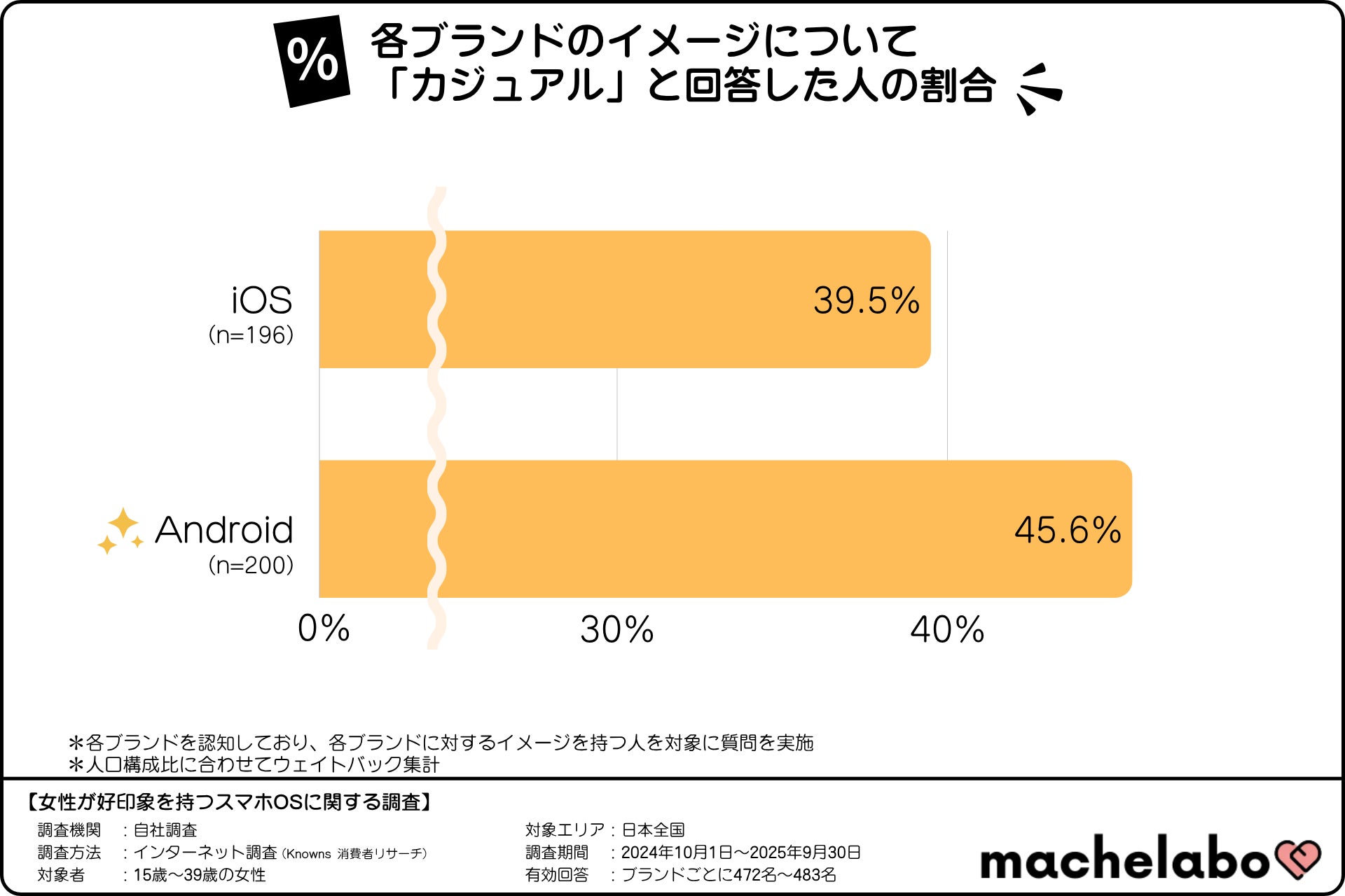 具体的な数字を見ると、Androidを「カジュアル」と評価した女性は45.6%にのぼり、iOSの39.5%を6.1ポイント上回りました。