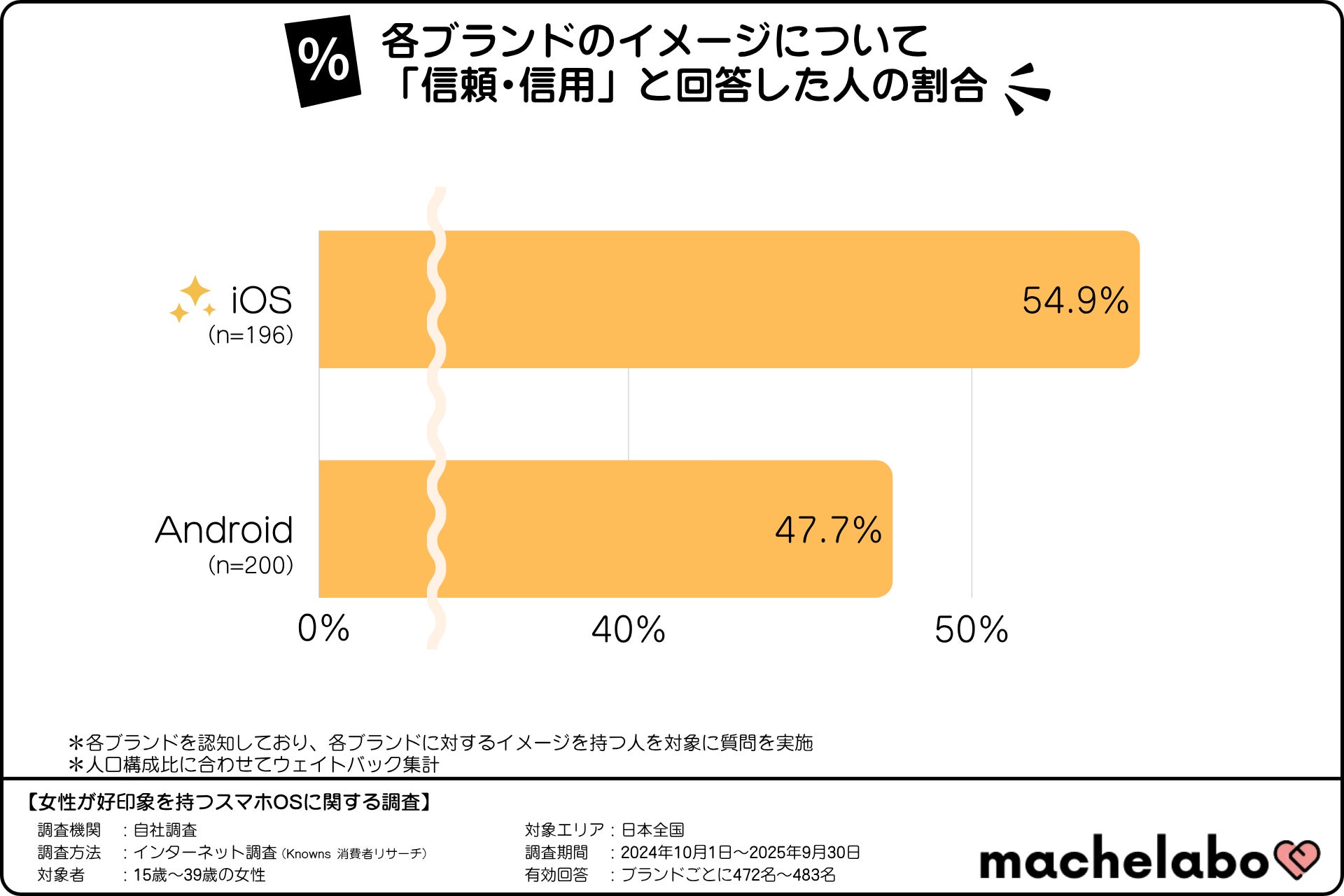 具体的には、iOSを「信頼・信用できる」と評価した回答者は54.9%にのぼり、過半数の支持を集めました。これに対し、Androidは47.7%となり、両者の間には7.2ポイントの差が見られます。