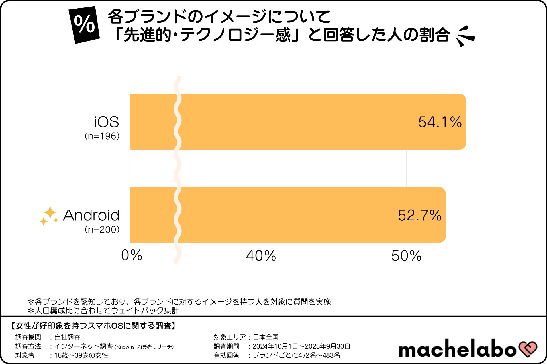 具体的な数値を見ると、iOSを「先進的」と評価した女性は54.1%、Androidは52.7%でした。その差はわずか1.4ポイントで、どちらも過半数の支持を集めており、ポジティブなイメージが持たれていることがわかります。
