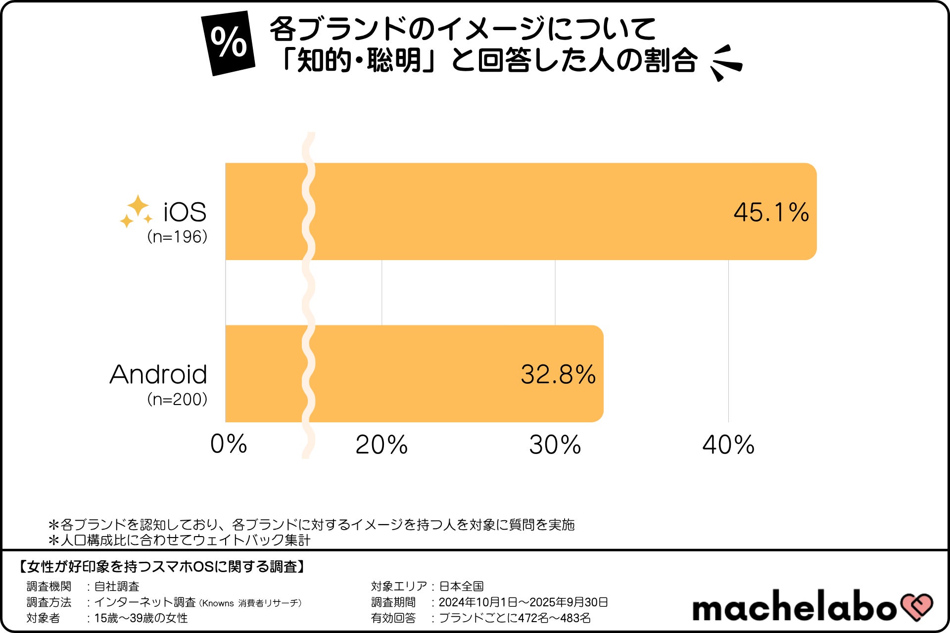 具体的な数字を見ると、iOSを「知的・聡明」と評価した女性は45.1%でした。一方のAndroidは32.8%で、両者の間には12.3ポイントもの差が開く結果となっています。