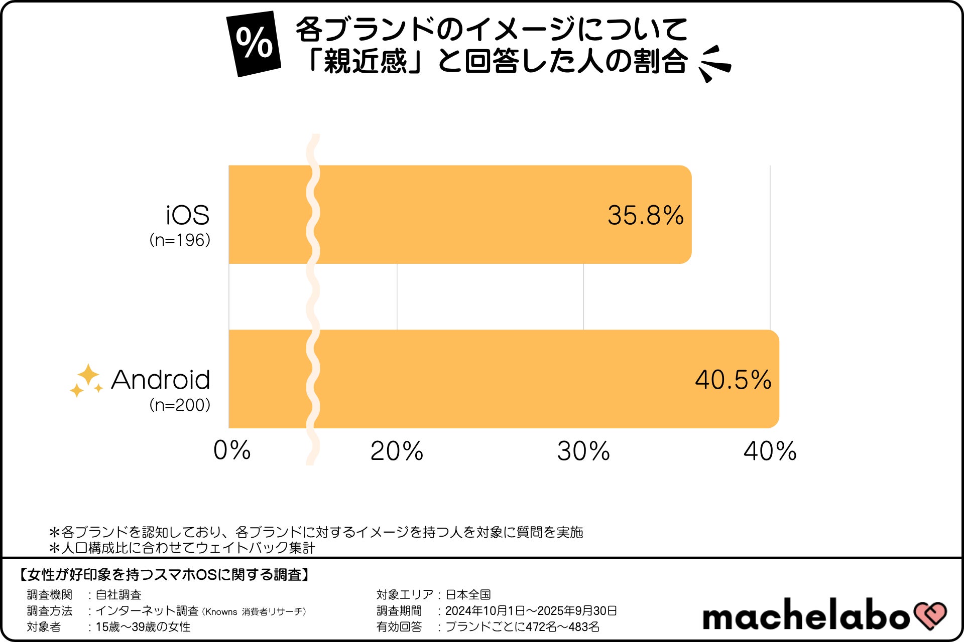 具体的には、Androidを「親近感がある」と評価した女性は40.5%で、iOSの35.8%を4.7ポイント上回りました。