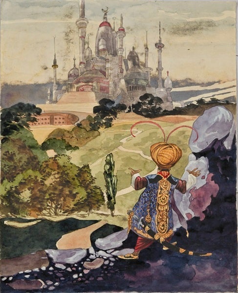 英国の挿絵画家、ルネ・ブルが描き、1912年に英国で発行された『アラビアンナイト』を写したものです。発刊早々に入手して丹念に模写したもので、最晩年まで衰えない、清親のあくなき好奇心が伺えます。