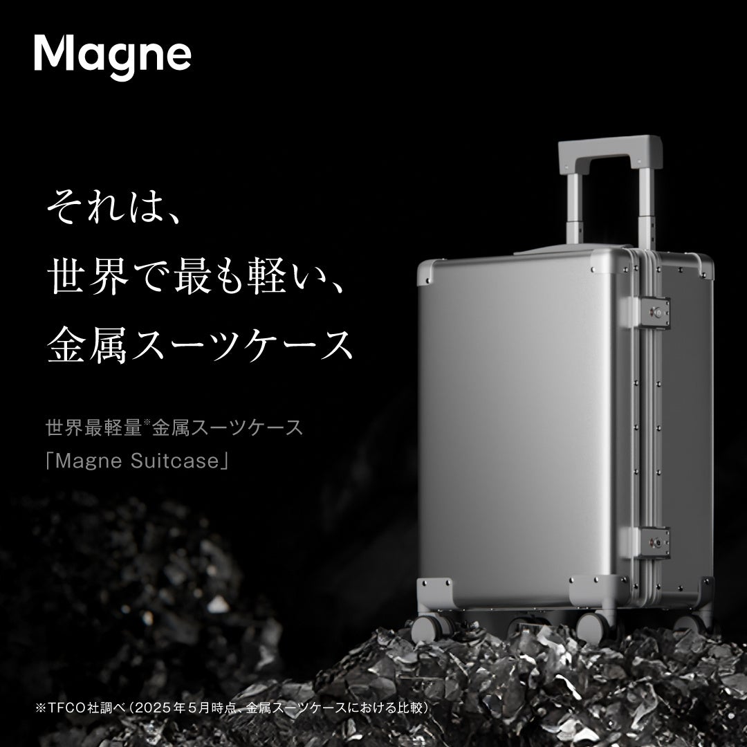 旅⾏ジャパン株式会社が⼿がける新ブランド『Magne』より、世界初※1の全⾯マグネシウム製スーツケース「Magne Suitcase」が登場。重量2.9kgと⾦属製スーツケースとしては世界最軽量※2を実現し、専⽤ボストンバッグ、収納ポーチと共に、応援購⼊サービス「Makuake」にて 2025年7⽉1⽇より先⾏販売開始。数量限定・先着にて、⼀般販売価格の実質最⼤30%OFFでお買い求めいただけます。