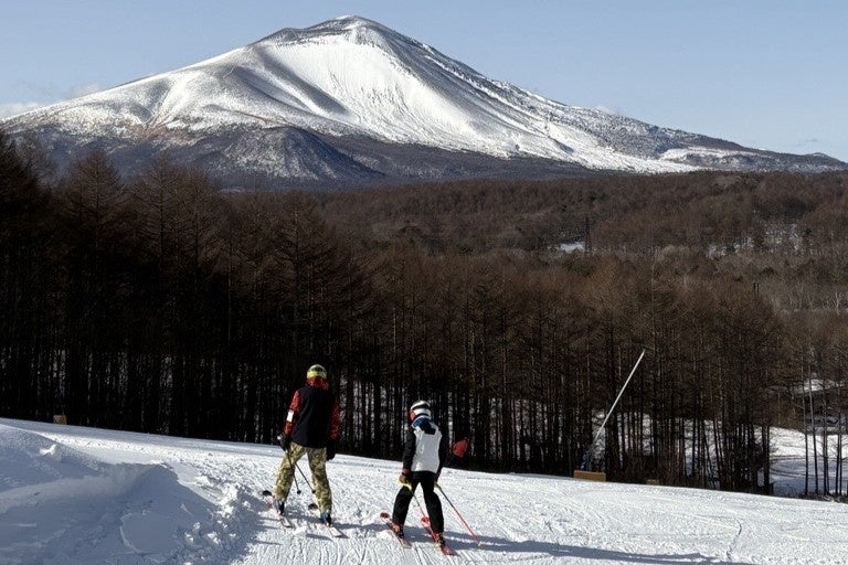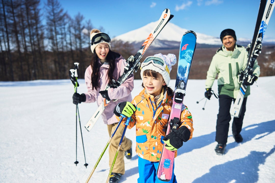 軽井沢スノーパークは、初級〜中級者向けの6つのコースやキッズエリアなどが広がる、家族にも初心者にもやさしいスキーリゾートです。シーズン中の晴天率が高いゲレンデに立つと、晴れ渡る空、白銀の高原とその向こうにそびえる浅間山が、視界いっぱいに広がり、思わず深呼吸したくなるような清らかな冬景色が迎えてくれます。