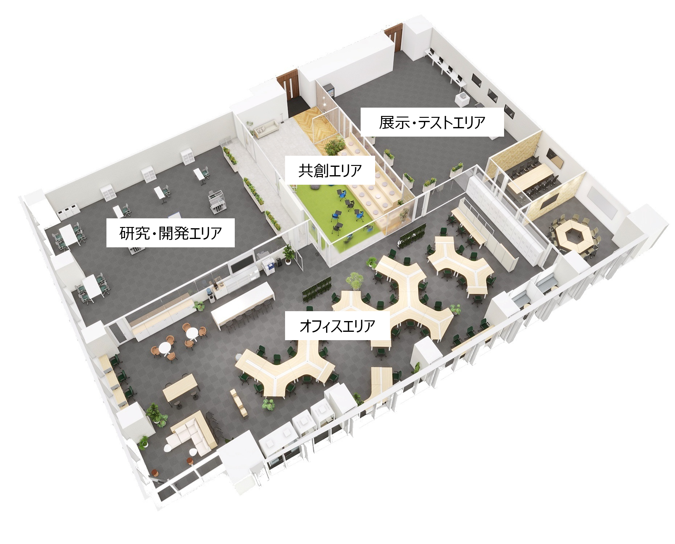 研究・開発エリア、共創エリア、展示・テストエリア、オフィスエリア |