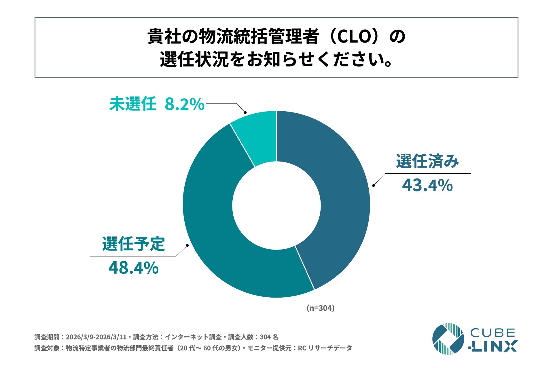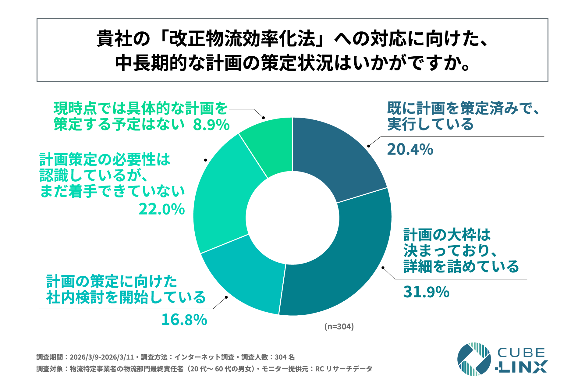 2026年4月に本格施行される「流通業務の総合化及び効率化の促進に関する法律及び貨物自動車運送事業法の一部を改正する法律(改正物流効率化法)」により、一定規模以上の荷主が特定事業者として指定され、規制対象範囲が大きく変化します。この法改正は企業の物流部門にとって、単なる法規制への対応にとどまらず、既存の物流体制や戦略の抜本的な見直しを迫る喫緊の課題となっています。しかし、その具体的な課題意識や対応状況はまだ十分に把握されていません。そこで、株式会社CUBE-LINXは、物流特定事業者の物流部門最終責任者を対象に、「改正物流効率化法への対応実態に関する調査」を実施しました。