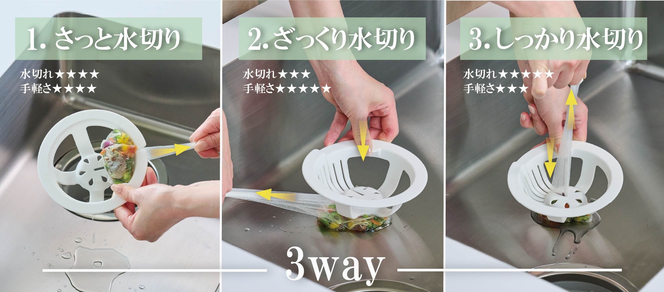 絞り方は、水切れ・手軽さに合わせて3way。お好みの方法で、誰でもラクに水切りが可能。