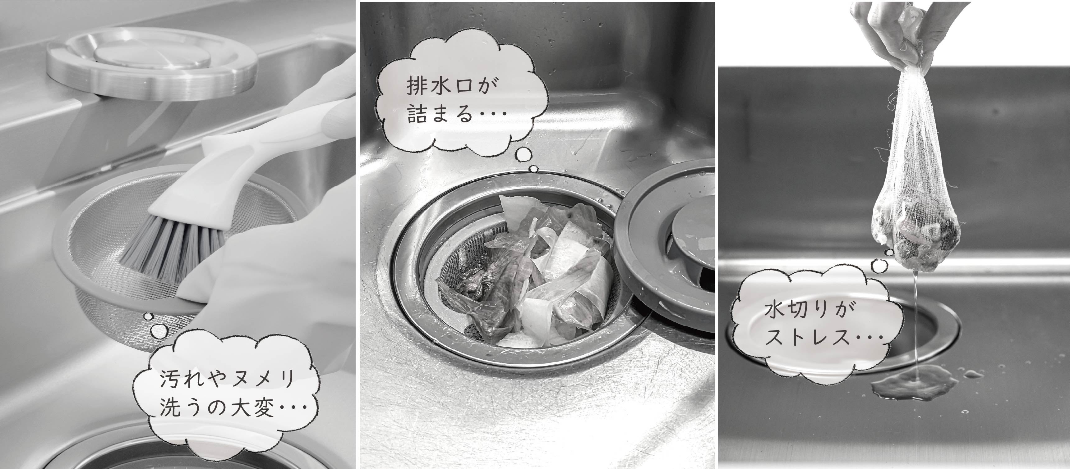 特に水回りは、片目をつぶってやり過ごしたいところですが、掃除を怠るとすぐにヌメリやカビの温床に…。シンクの排水口に元々付いている排水口カゴは、ステンレスや樹脂製のメッシュが多く、洗いづらいことで後回しにしがち。掃除を楽にしたくて、使い捨ての排水口ネットを使用しても、カゴは汚れてしまう。ゴミを沢山捨てると、水が詰まって排水口カゴ自体が浮き上がり、隙間からゴミが流れてしまう。排水口ネットをゴミ箱に捨てる時に水が垂れてストレス…。