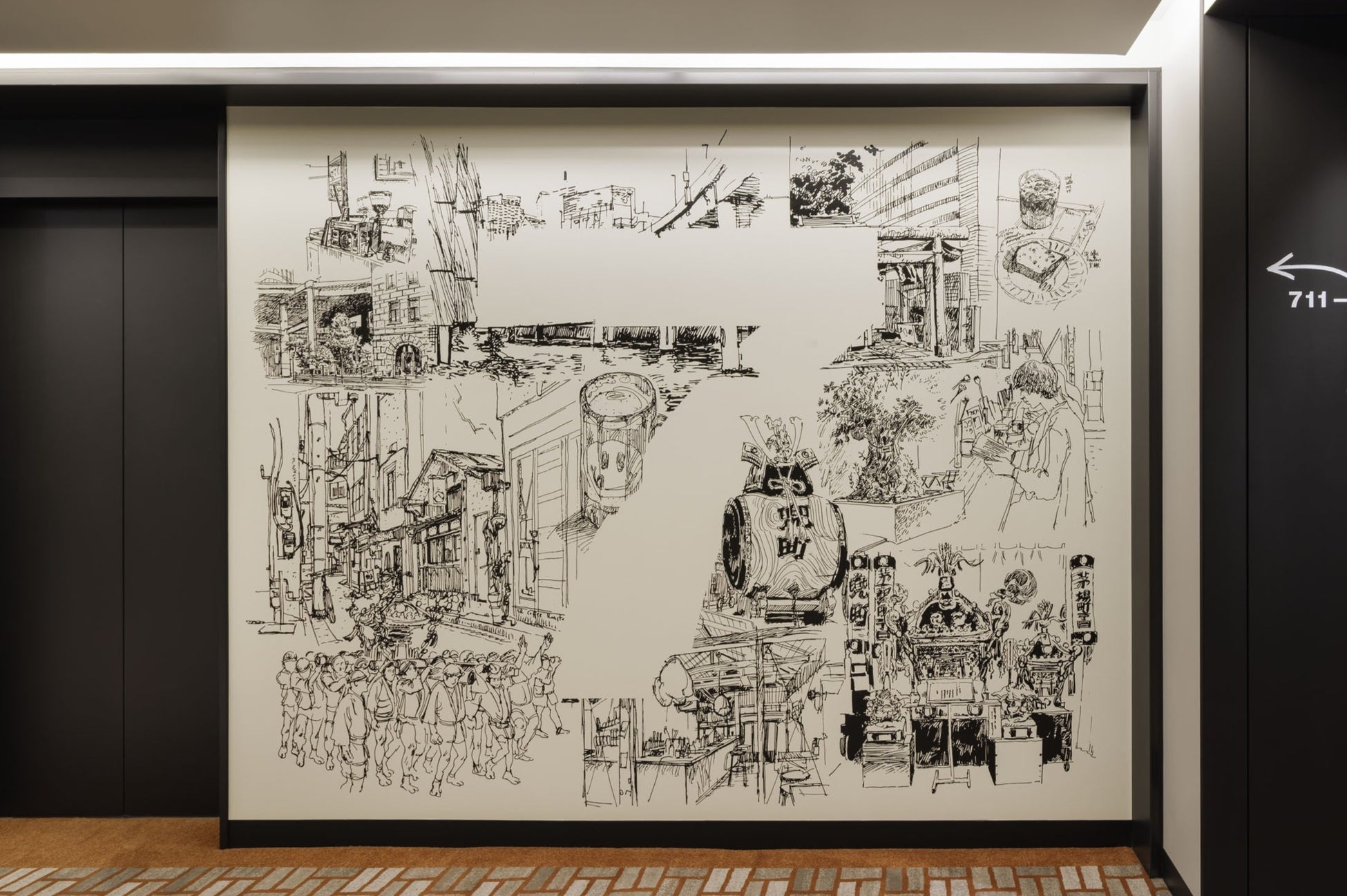 オーストラリア出身、東京在住のイラストレーター。街の風景や人々の営みを軽快で温かみのあるタッチで描き、客室バスルームや1階のギャザリングスペース、エレベーターホールに展開しています。兜町の日常の息づかいを表現し、ゲストを街とつなげます。