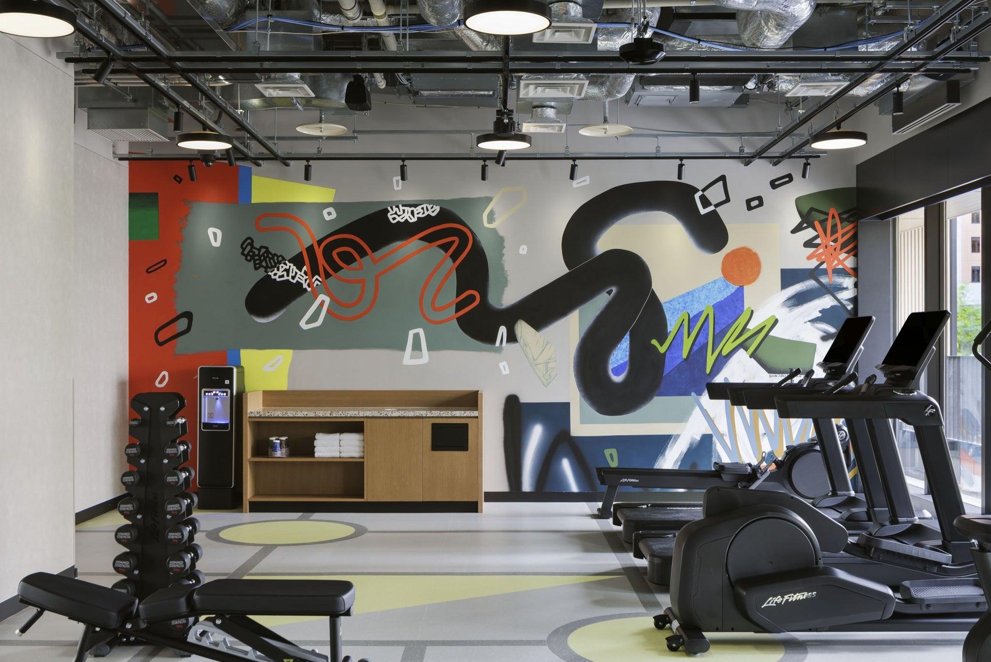 デジタルとアナログの境界を越えた独自の作風で知られるマルチメディアアーティスト。フィットネスジムの壁画では、黒い線を金融の動きや細胞のリズムになぞらえ、循環とエネルギーを表現しました。都市のダイナミズムと生命の営みを重ね合わせたアートが、空間に力強さを与えています。