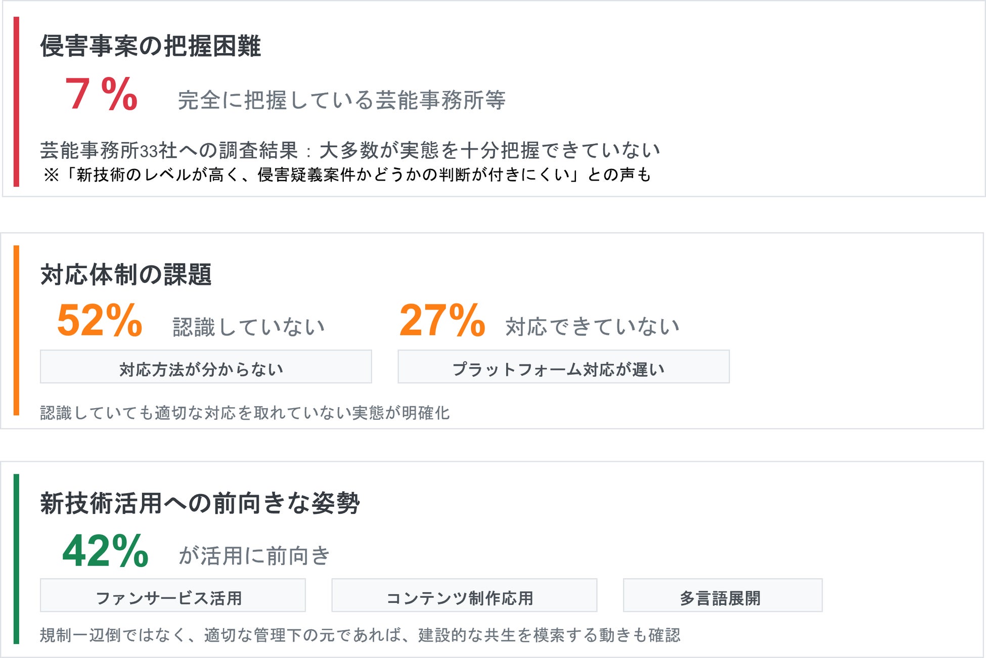 本調査を通じて、生成AIなどの技術革新により、これまでのアナログな侵害疑義事案から、SNSを中心としたデジタル上での全く新しい形態の侵害疑義事案が、世界規模で同時多発的に広がっている現状が明らかになりました。