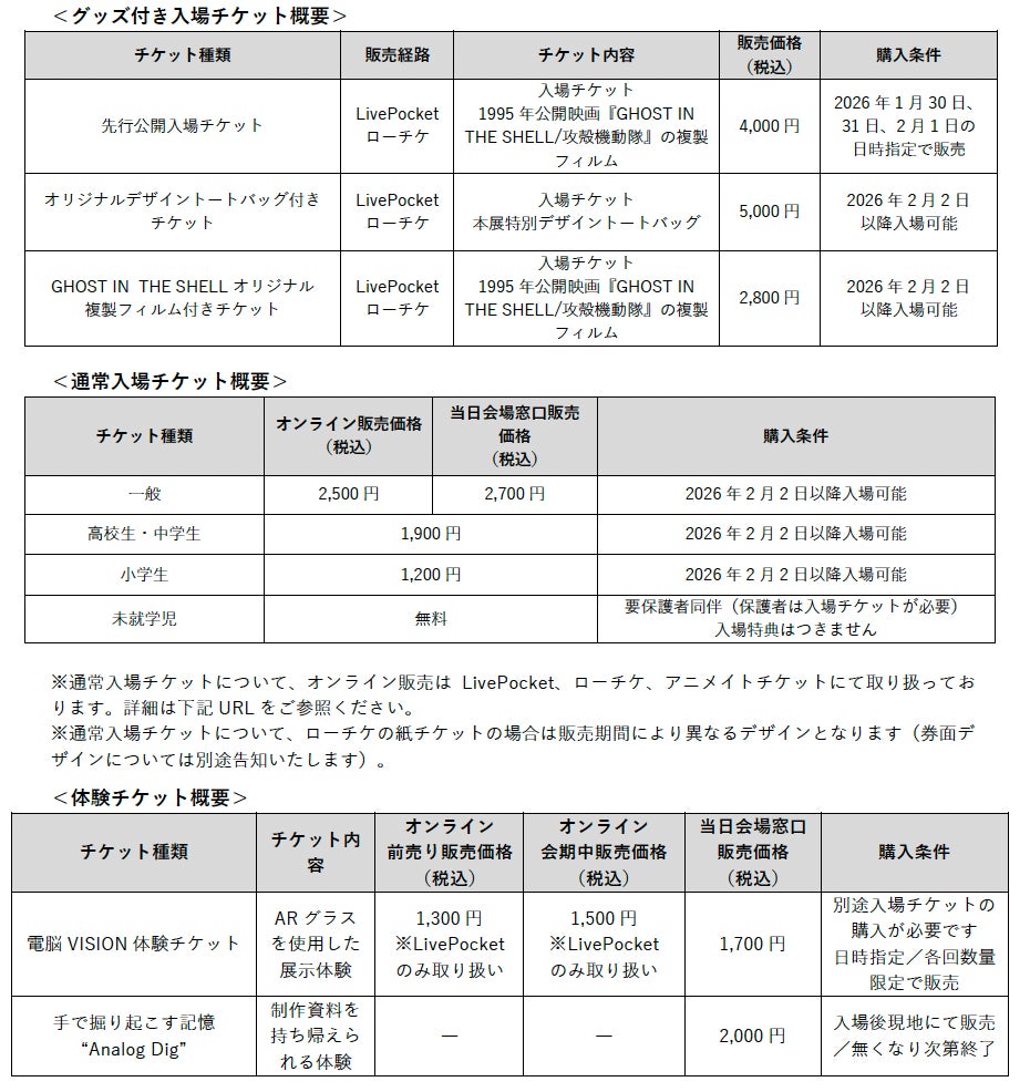 <LivePocket>https://sp.livepocket.jp/exhibition-ghostintheshell <ローチケ>https://l-tike.com/ghostintheshell-ex/ <アニメイトチケット>https://animate-ticket.com/events/25 ※プレイガイド別に購入できるチケットが異なりますので、ご注意ください ※各チケット詳細は、公式ホームページにて、公開されます ※現地にて当日券もご購入いただけます |