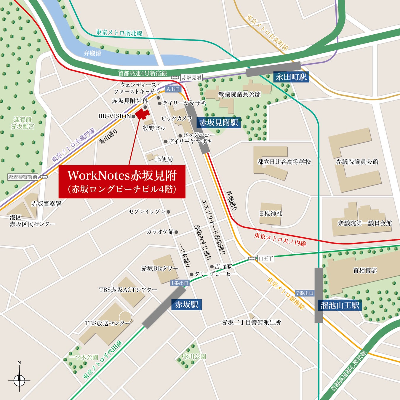 東京メトロ銀座線・丸ノ内線「赤坂見附」駅徒歩1分、 東京メトロ半蔵門線・有楽町線・南北線「永田町」駅徒歩8分、 東京メトロ千代田線「赤坂」駅徒歩7分 |