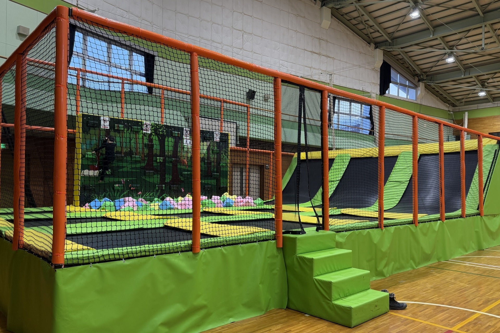 同施設を「日中はファミリーが集まるキッズランド、夜は体操やダンスのレッスンスペース」として機能させるべく、今回ワン・ステップよりトランポリンパークをご納品いたしました。