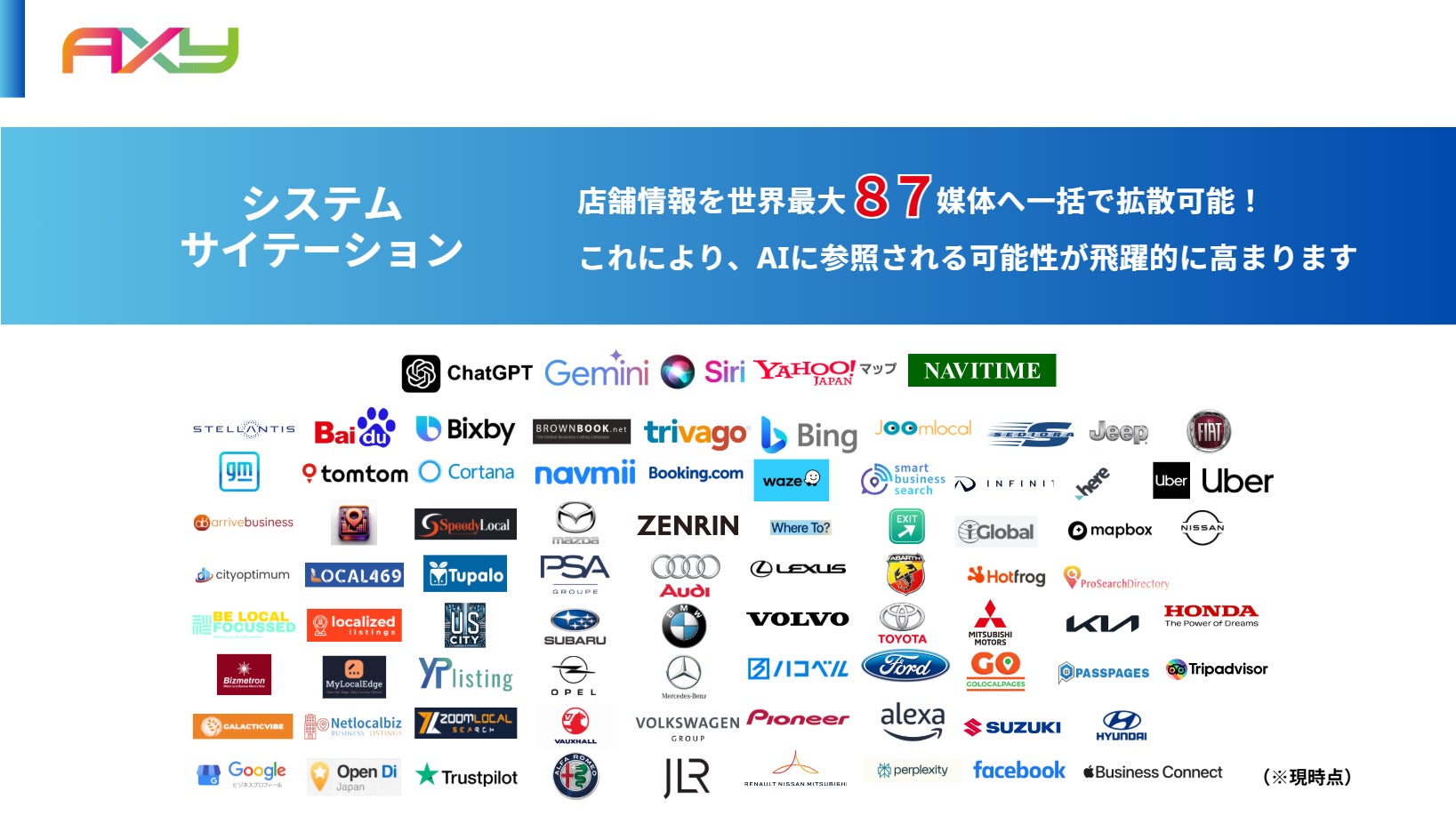 今回の媒体追加により、AXiYシステムは合計160媒体への情報一括最適化を実現しました。これにより、企業や店舗の情報発信は一層「AIに拾われる構造」へと進化します。