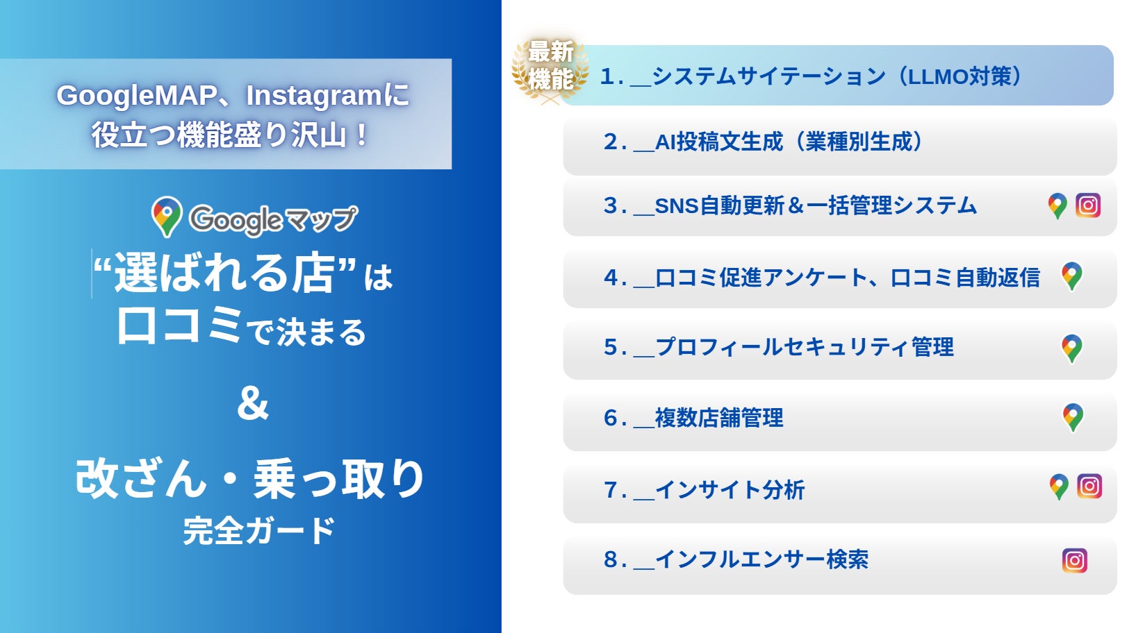 さらに、システムサイテーション機能により、店舗情報を世界最大87媒体に一括配信。AIに正確で信頼できる情報源として認識される構造を自動的に形成します。