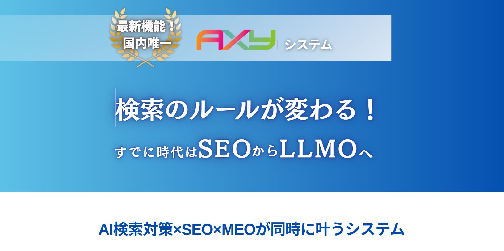 AXiYシステムは、AI検索(LLMO)×MEO×SEOを同時に最適化する国内唯一のシステムです。