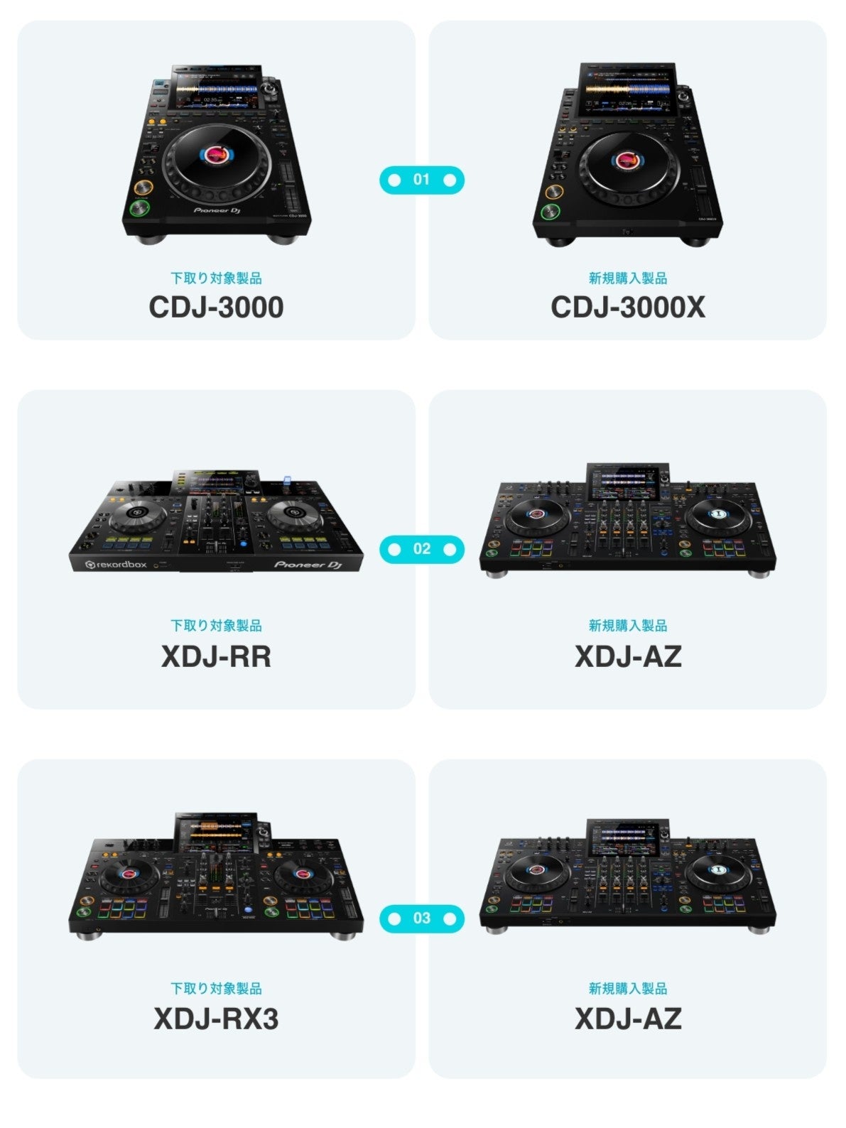 初期展開では、「CDJ-3000X」への買い替えに伴う「CDJ-3000」の下取り、および「XDJ-AZ」への買い替えに伴う「XDJ-RR」「XDJ-RX3」の下取りを開始します。