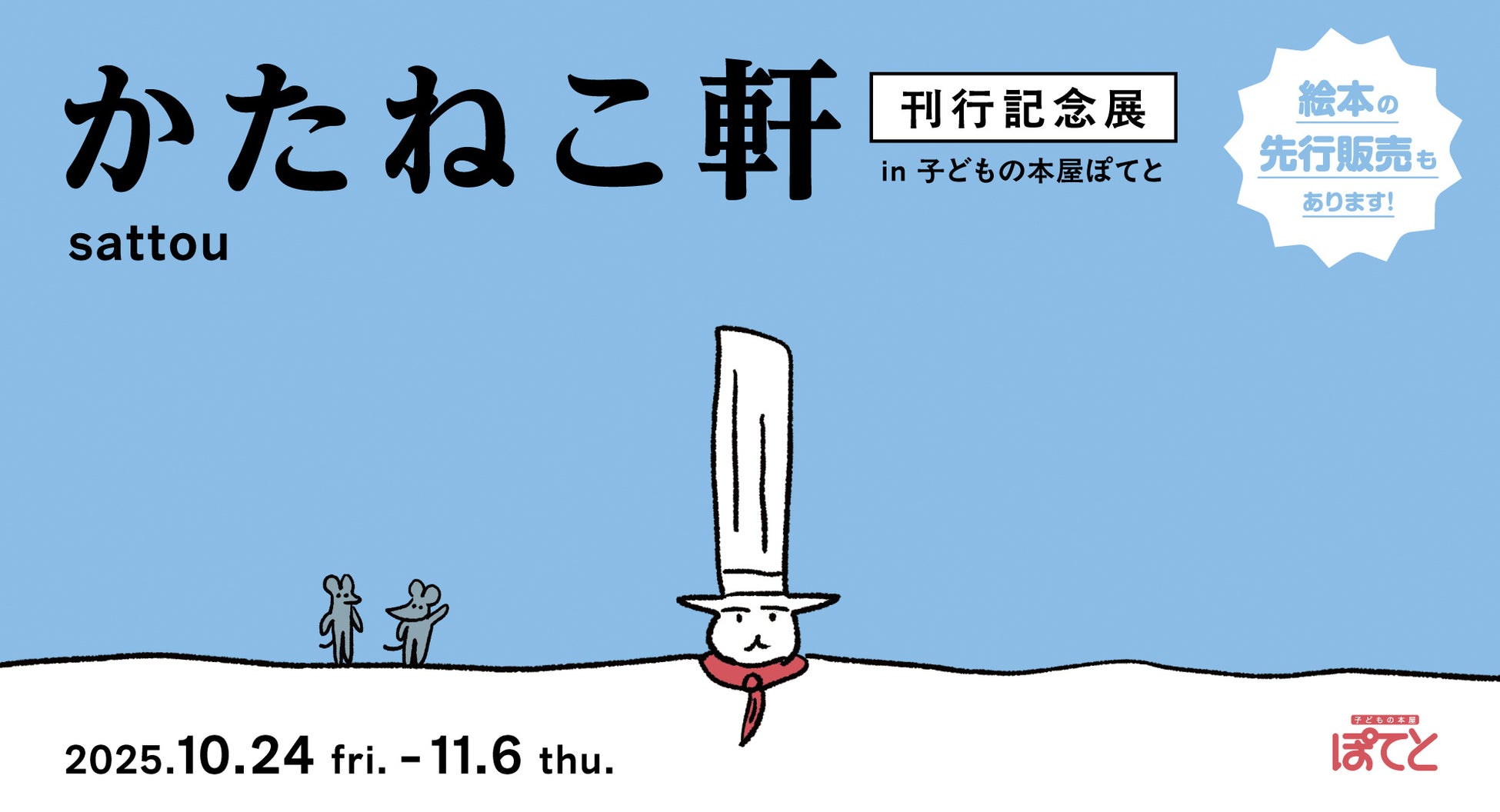 絵本の刊行を記念して、絵本の先行販売&刊行記念展を大阪・北浜の「子どもの本屋ぽてと」にて開催いたします。パネル、描き下ろし作品の展示/販売のほか、『かたねこ軒』オリジナルグッズの展開も予定。作家在廊日に、sattou氏と直接お話しできるチャンス。作品の世界をリアルに感じられるインパクトのある展示をお楽しみください。