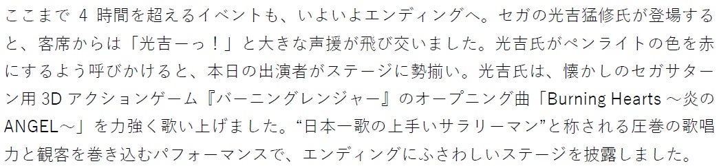 次に、“日本一歌の上手いサラリーマン”としてゲームファンに広く知られるセガ社員の光吉猛修氏が、金色の着物姿で登場し、会場からは大歓声と笑いが起こりました。「出オチか!」という自虐的なコメントで観客を沸かせた後、ゲキチュウマイ(オンゲキ・CHUNITHM・maimai でらっくす)のマスコットキャラクターであるはっぴーとチュウニペンギンを従えて「怒槌(イカヅチ)」を披露。さらに「マツケンサンバⅡ」を美声で歌い上げ、会場は一気にお祭りムードに包まれました。